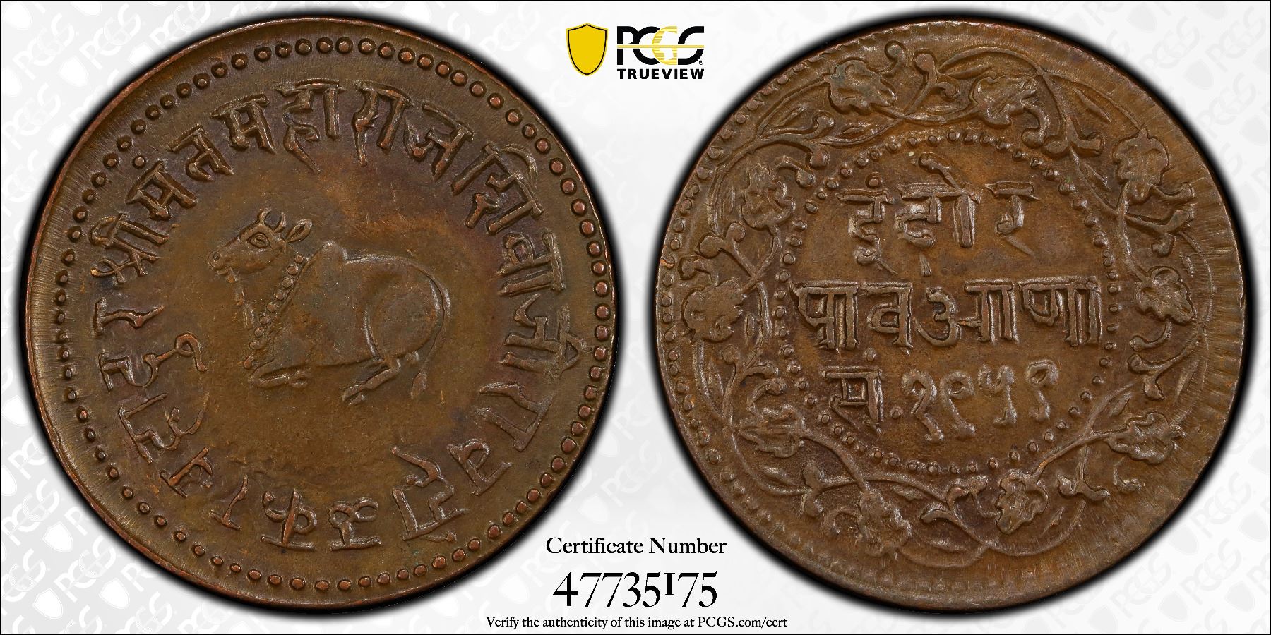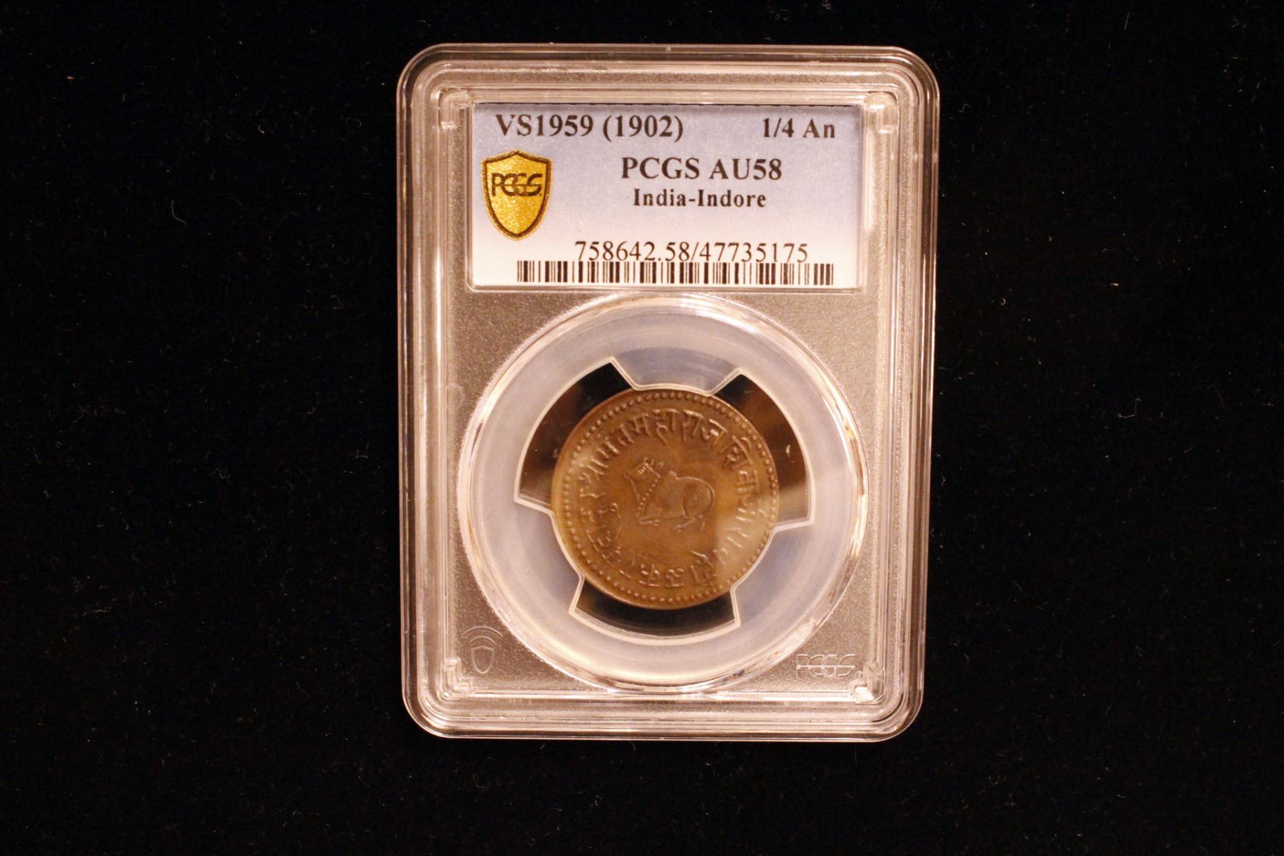 INDORE: Shivagi Rao, 1875-1938, AE 1/4 anna, VS1959, KM-33.3, gorgeous strike, PCGS graded AU58