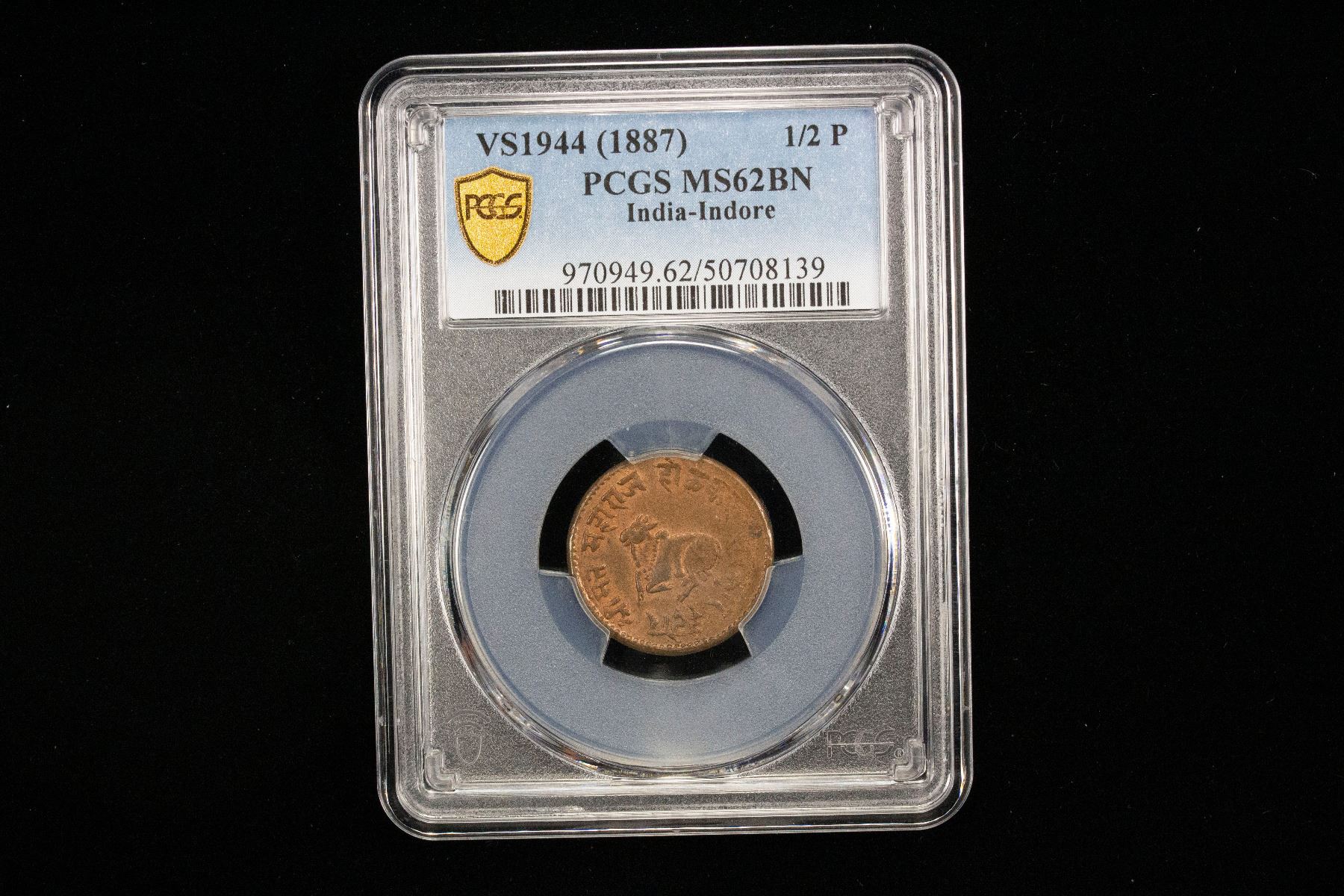 INDORE: Shivaji Rao, 1886-1903, AE 1/2 paisa, VS1944 (1887), KM-30.1, a pleasing lustrous mint state example, PCGS graded MS62 BN.
