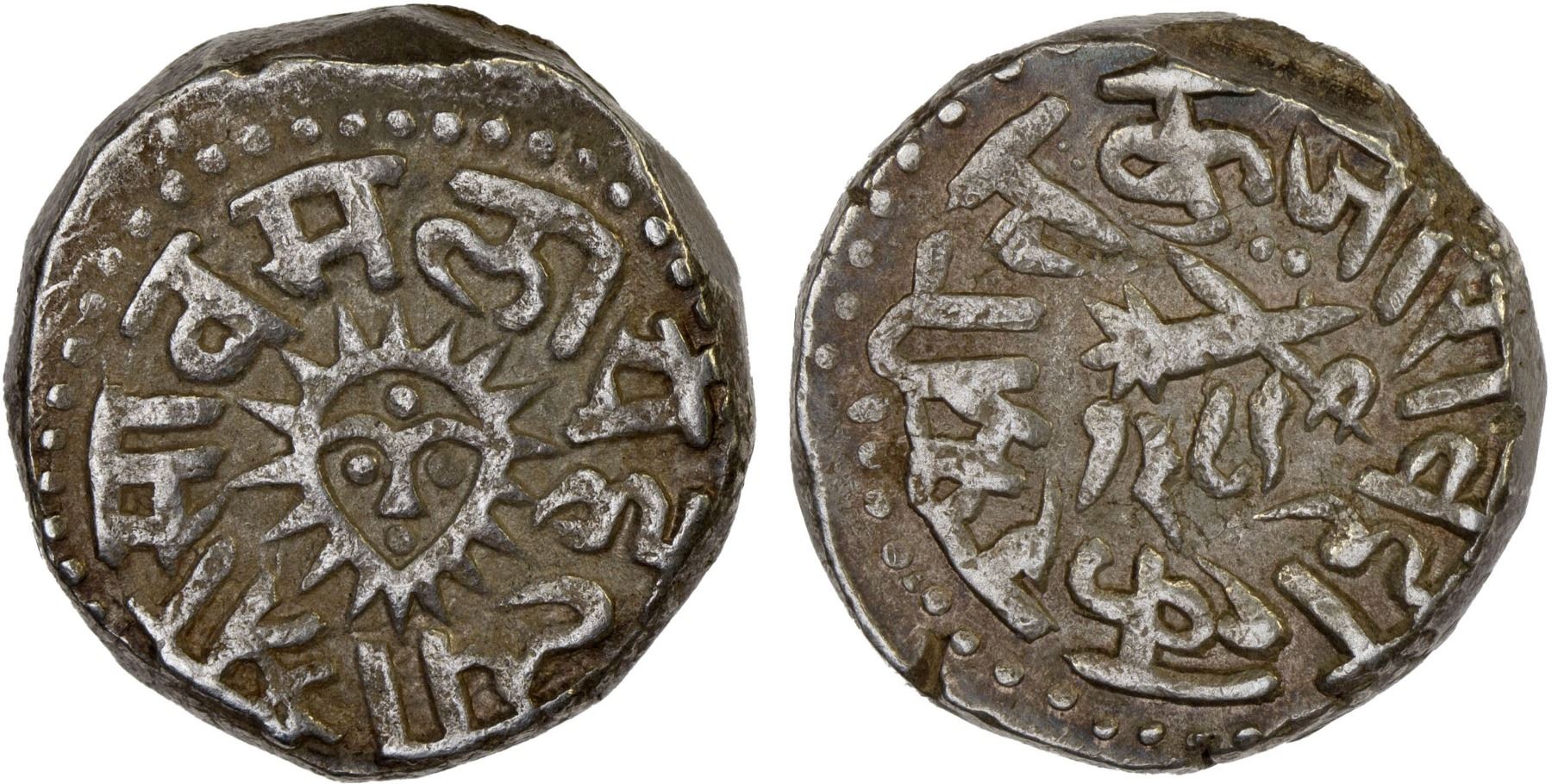 INDORE: Tukoji Rao, 1844-1886, AR mudra rupee (11.17g), AH1289, Y-24, date in Devanagari in the reverse center, XF, ex Paul Stevens Collection.