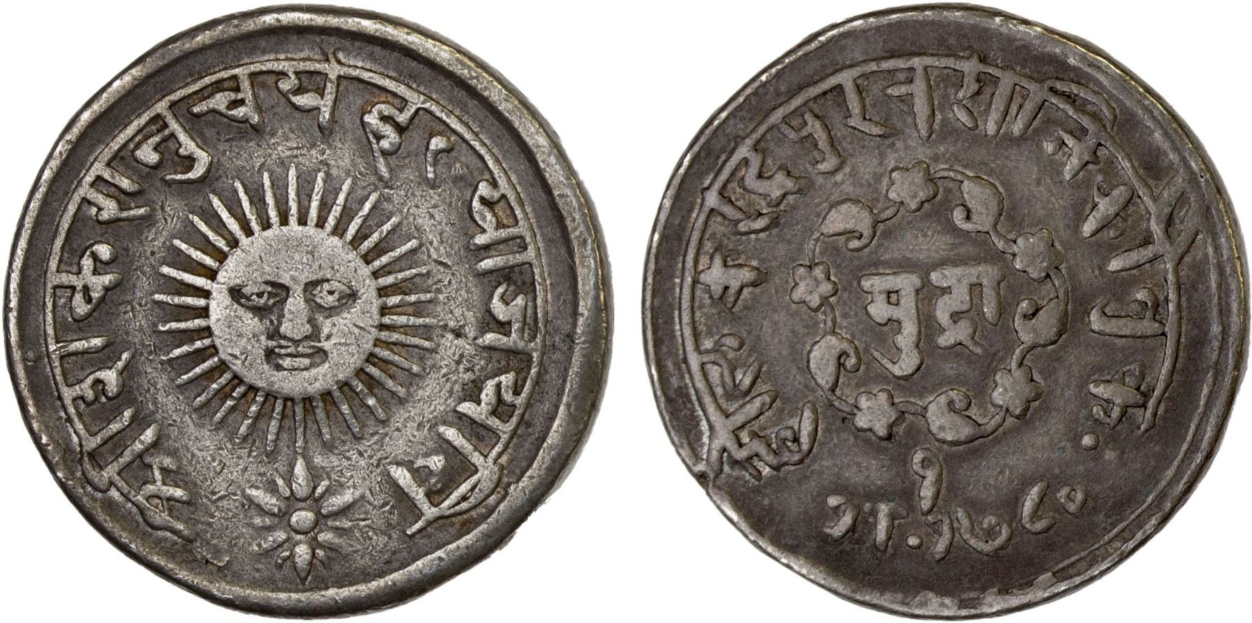 INDORE: Tukoji Rao II, 1844-1886, AR mudra (11.07g), SE1780 (1858), KM-15, sunburst encircled by Devanagari legend sri shankarayacharya ahlya jayati // denomination mudra surrounded by legend holkarendra puravaraji kautuka / saka 1780, small cut on rim, accompanied by collector's information card, VF, RR, ex Anton Holt Collection.