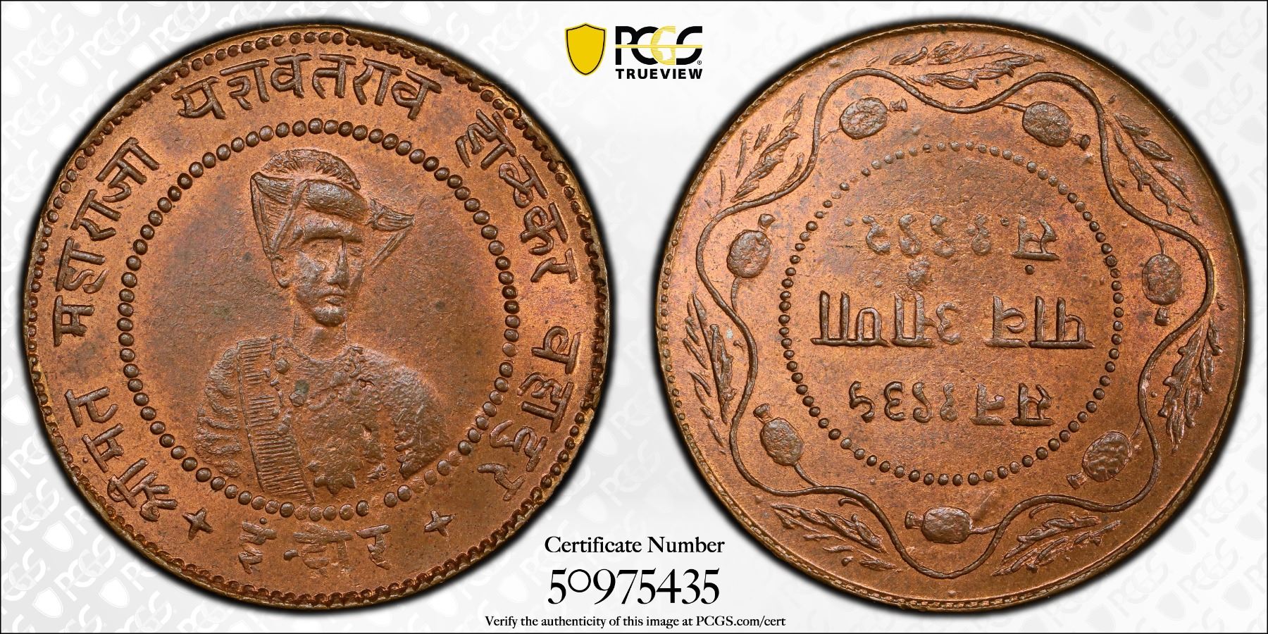 INDORE: Yashwant Rao II, 1926-1948, AE 1/4 anna, VS1992 (1935), KM-49, a superb lustrous example! PCGS graded MS65 RB. Tied for the finest example at PCGS.