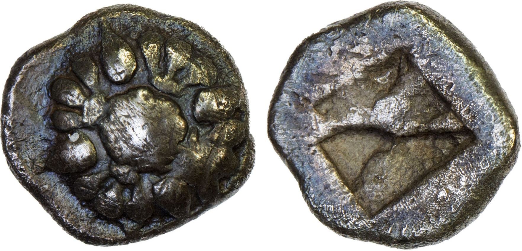 IONIA: Erythrai, AR obol (0.82g), ca. 550-500 BC, cf. Klein 387 (hemiobol), rosette with large central pellet // irregular square punch, VF, ex James Lamb Collection. See Roma Numismatics e-Sale 110, Lot 390 for a similar example.