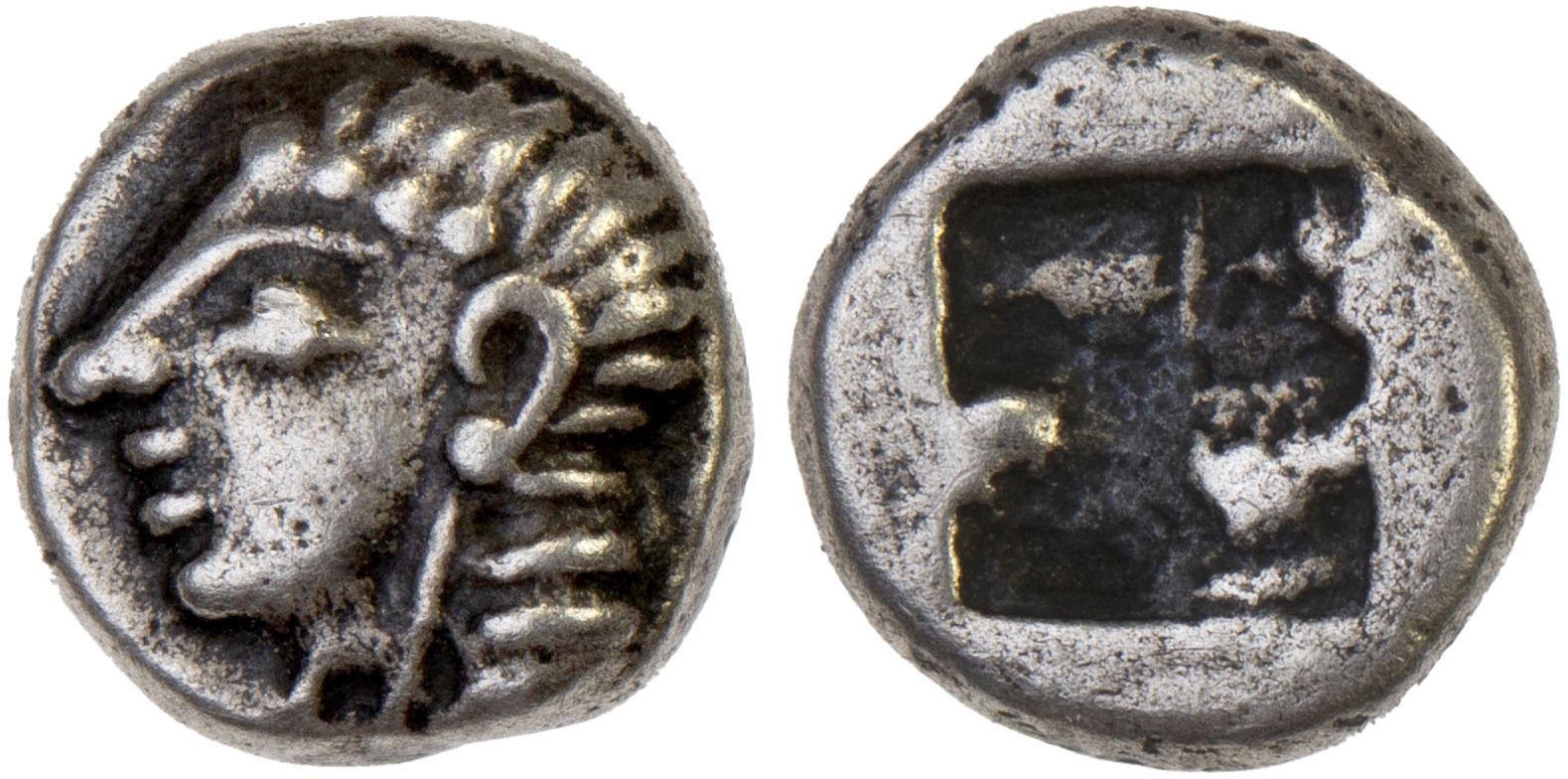 IONIA: Kolophon, AR hemiobol (0.43g), ca. 530-500 BC, SNG Kayhan 342, archaic head of Apollo left // incuse square punch, well-centered strike, VF, ex James Lamb Collection.