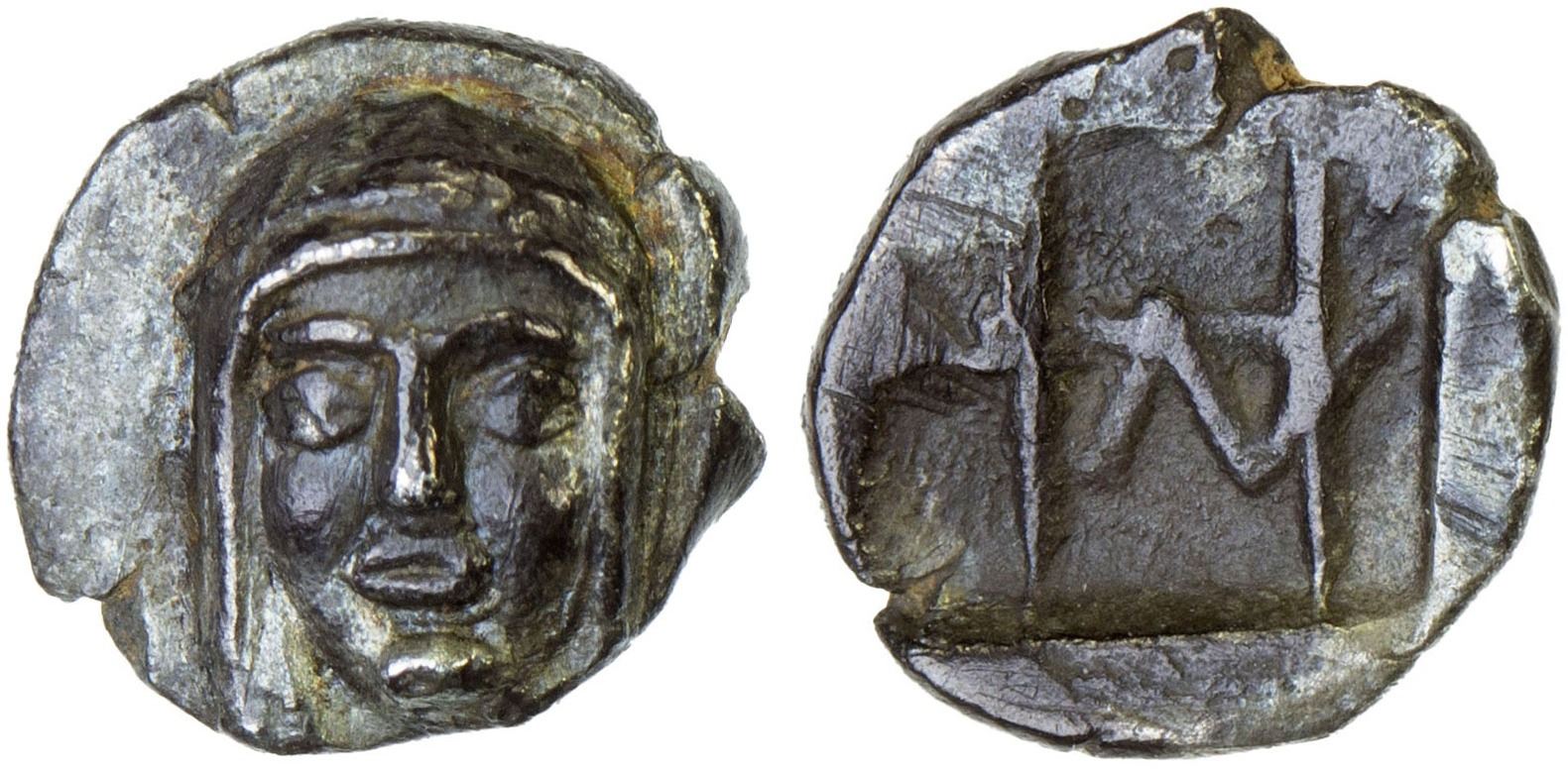 IONIA: Kolophon, AR hemiobol (0.47g), ca. 450-410 BC, Milne-5, Klein-397, head of Apollo facing, laurel leaf to either side // HM monogram (mark of value) within incuse square, a wonderful bold portrait, faint scratches, Choice VF, ex James Lamb Collection.