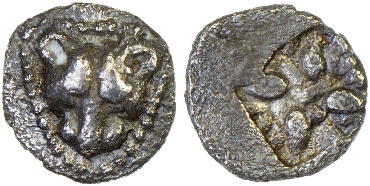 IONIA: Miletos, AR 1/64 stater (0.18g), ca. 550-525 BC, cf. SNG Kayhan 461 (1/32 stater), lion scalp facing within dotted triangular border // stellate design within incuse square, VF, ex James Lamb Collection, ex Nomos Web Auction 12, Lot 335.