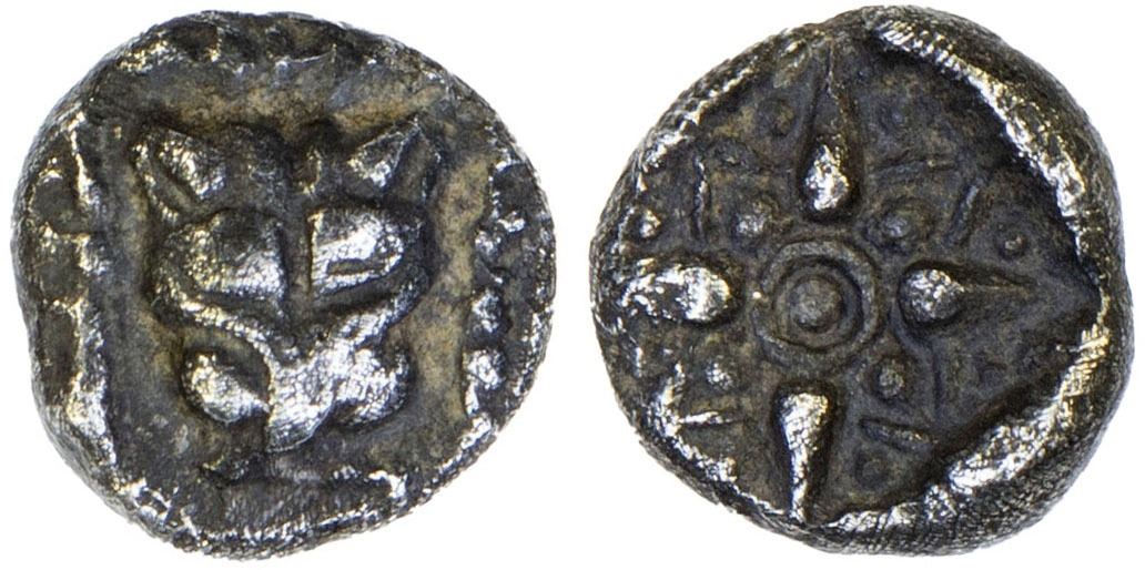 IONIA: Miletos, AR 1/64 stater (0.19g), ca. 550-525 BC, Klein-423a, lion scalp facing within dotted square border // stellate design within incuse square, VF, ex James Lamb Collection, ex Busso Peus.