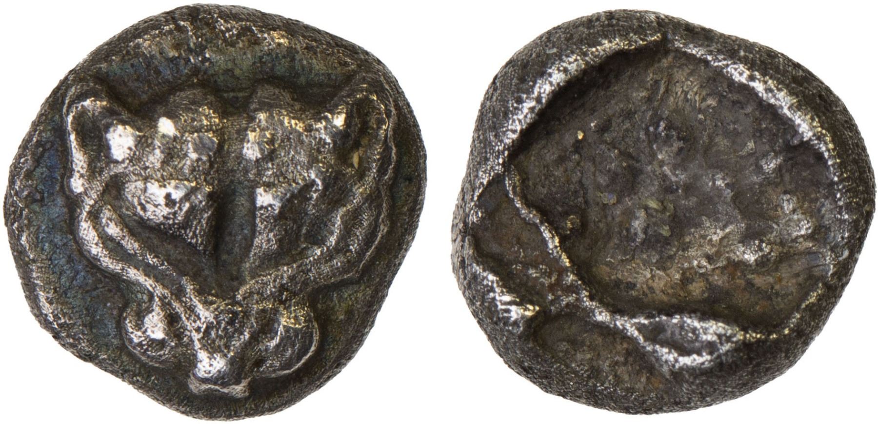 IONIA: Miletos, AR obol (0.59g), late 6th-early 5th century BC, cf. SNG Kayhan 461 (denomination), lion scalp facing // stellate design within incuse square, struck with a broken reverse die, VF, ex James Lamb Collection.