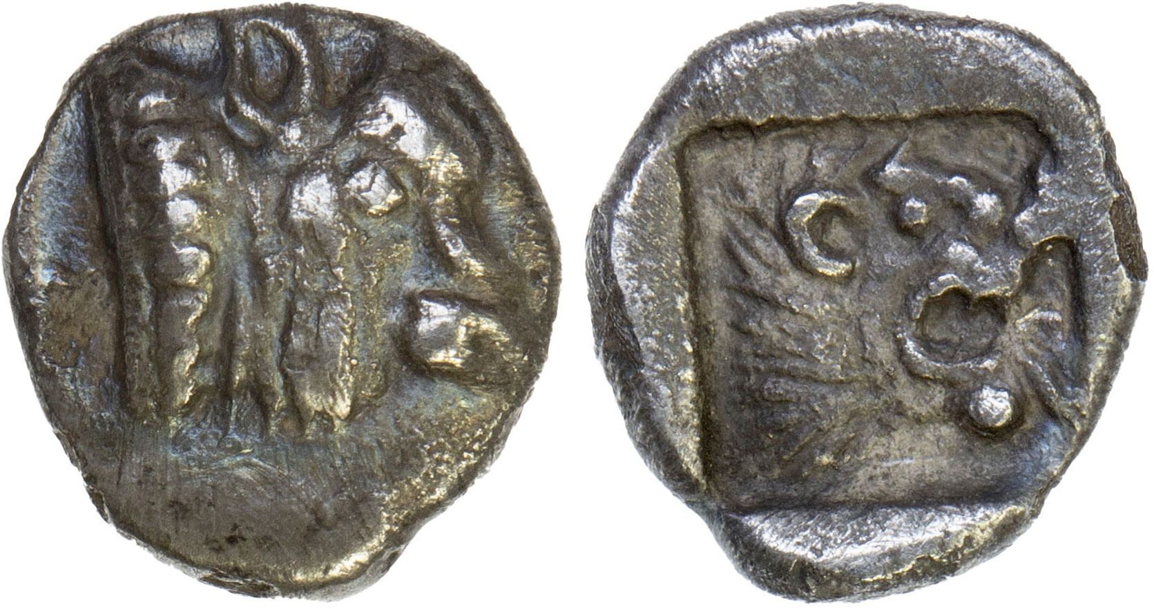 IONIA: Samos, AR hemiobol (0.33g), 6th-5th century BC, BMC-27, head of bull right // head of lion right within incuse square, a nice strike with clear details, VF, ex James Lamb Collection.