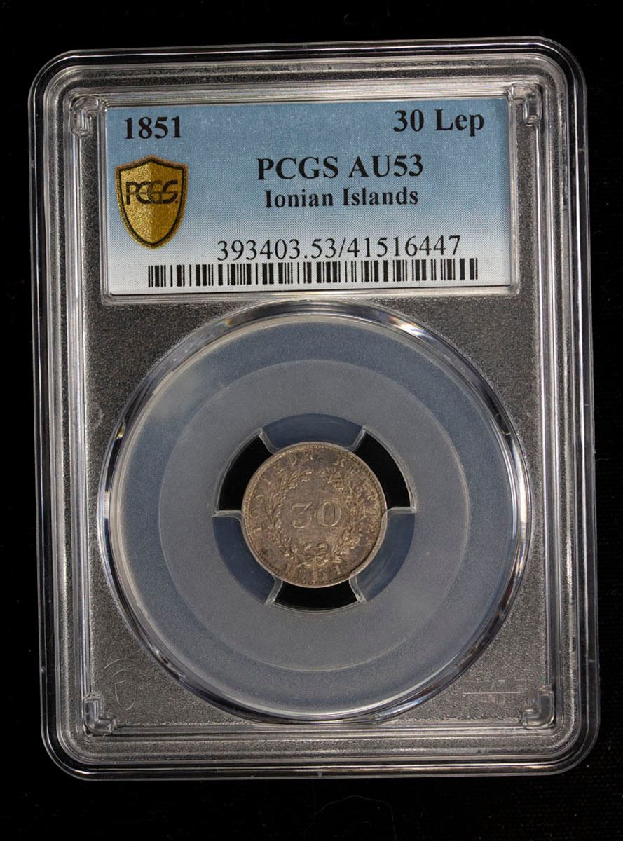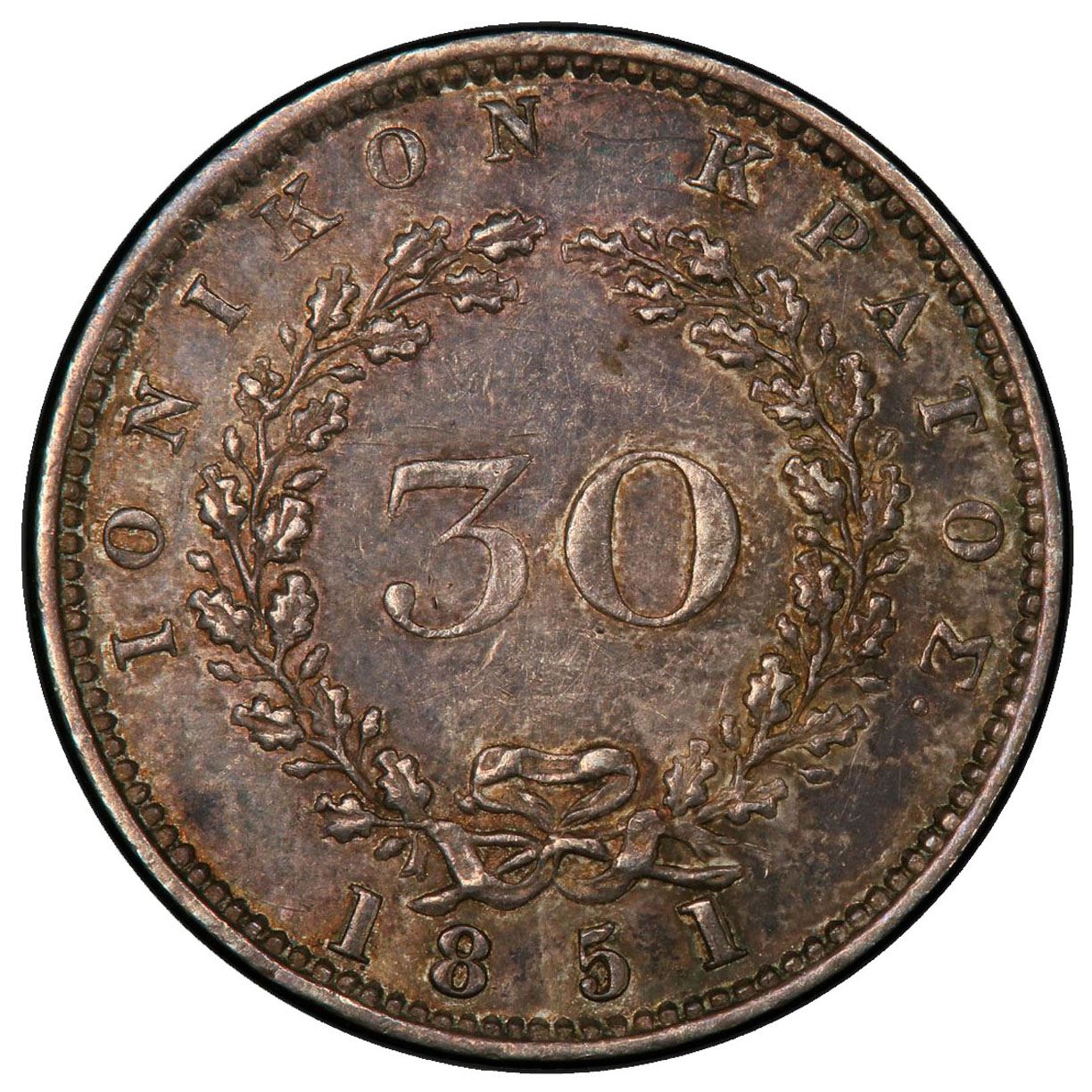 IONIAN ISLANDS: British Protectorate, AR 30 lepta, 1851, KM-35, an attractive example with old toning, PCGS graded AU53.