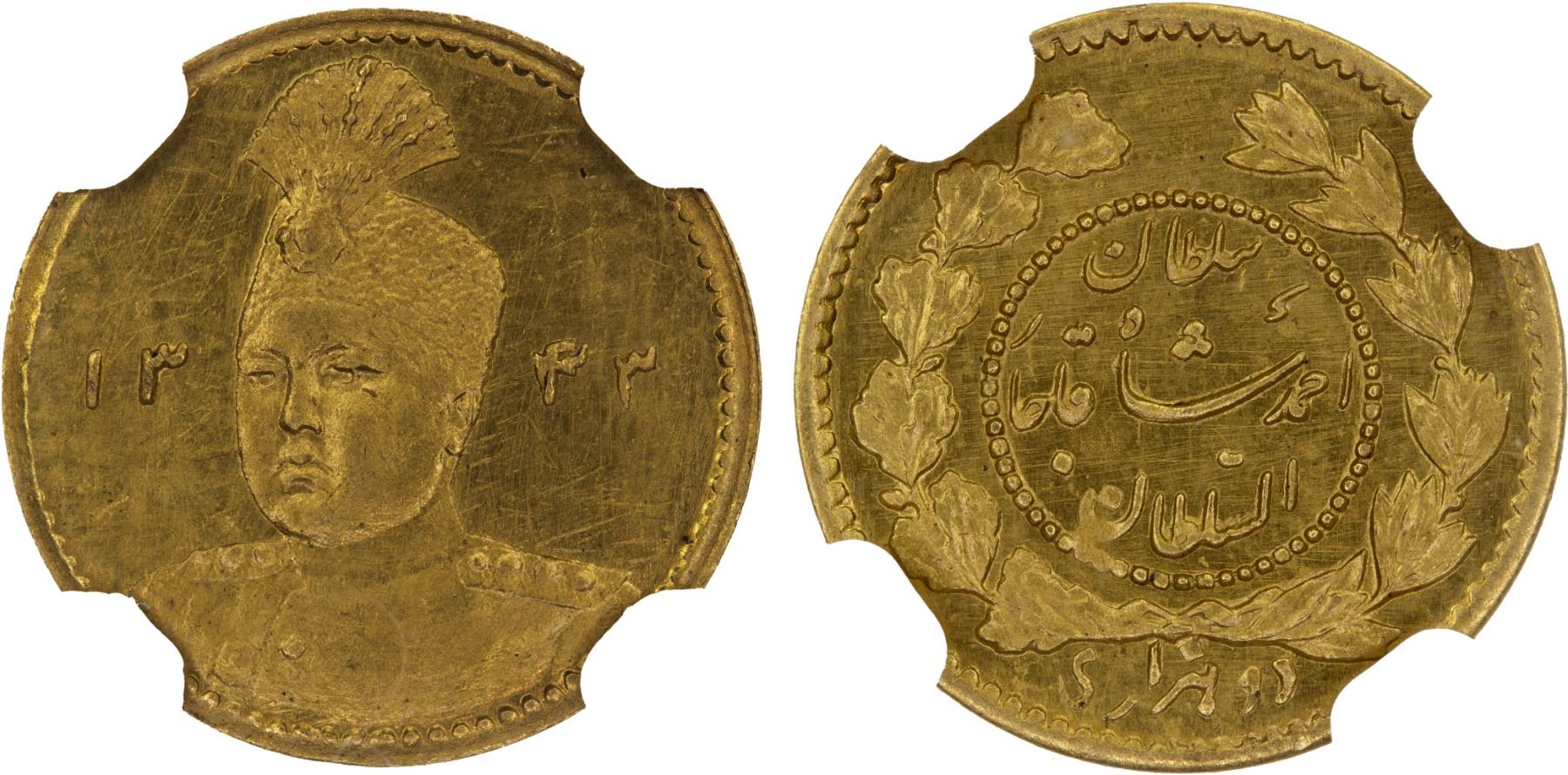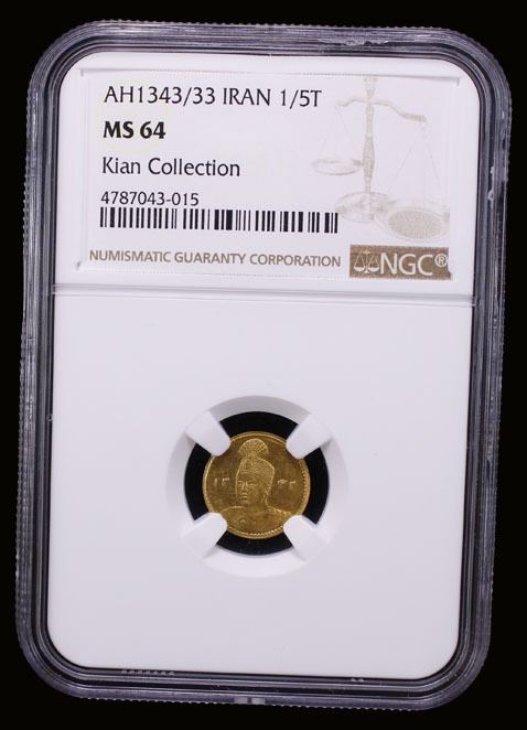 IRAN: Ahmad Shah, 1909-1925, AV 1/5 toman, AH1343 year 33, KM-1070. Fr-83, 4 over second 3 in date, lustrous, NGC graded MS64, ex Kian Collection, ex The 1914 Collection. Finest graded by both NGC and PCGS.