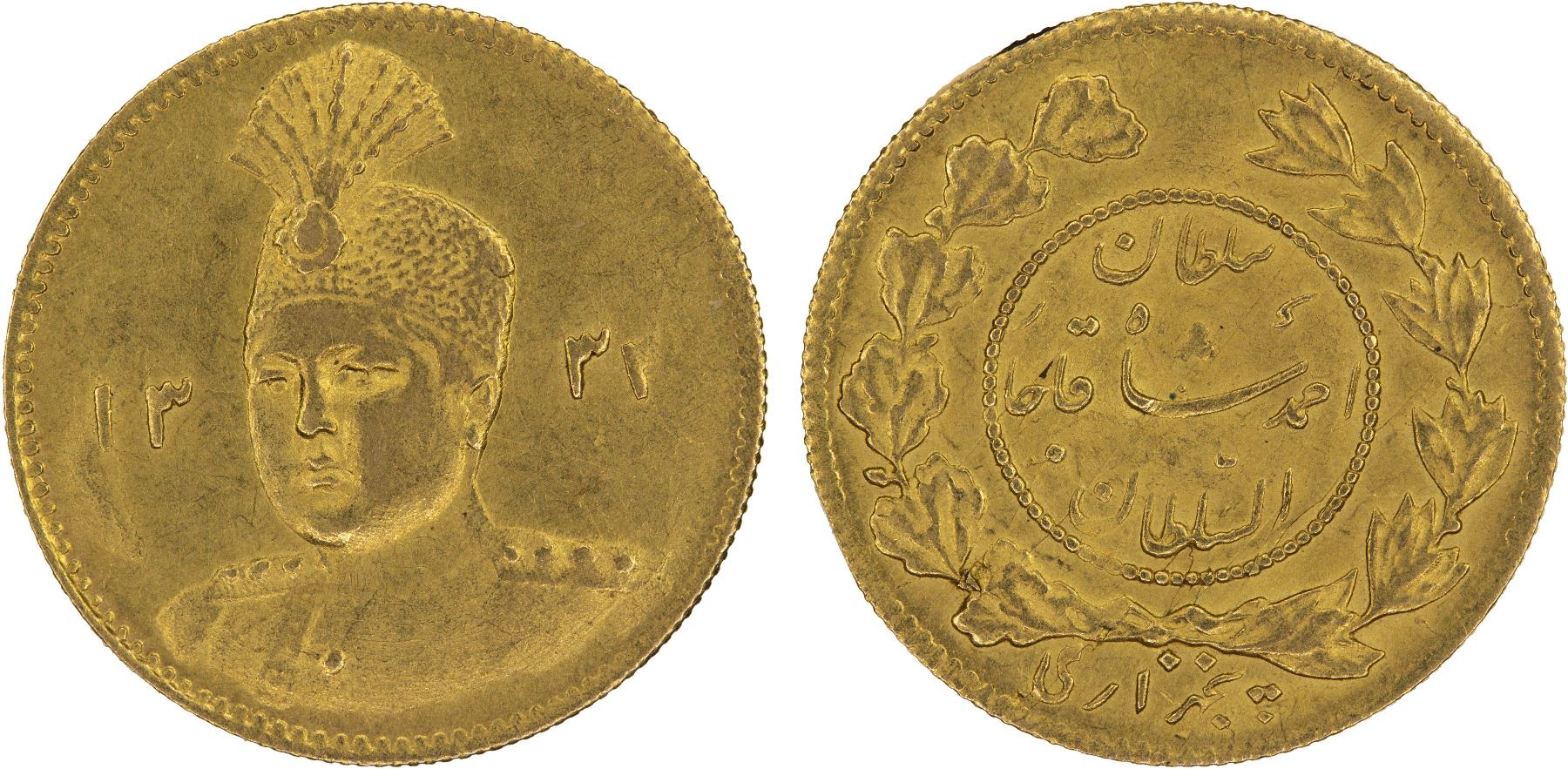 IRAN: Ahmad Shah, 1909-1925, AV 5000 dinars (1.41g), AH1332, XF