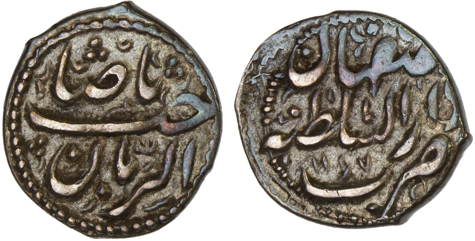 HOTAKI: Azad Khan, 1750-1757, AR shahi (1.12g), Isfahan, AH1167, A-2733.1, type E1, choice VF, R.