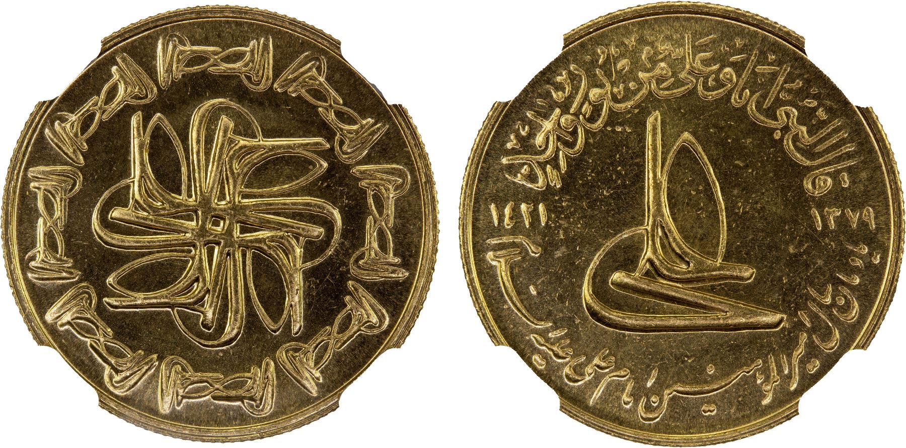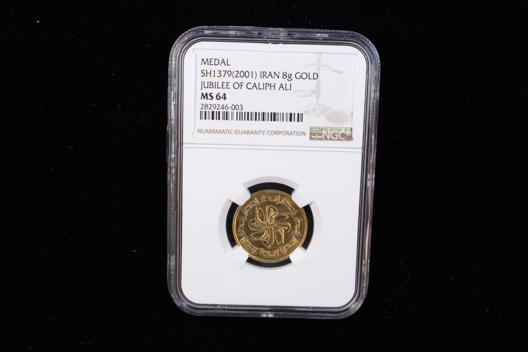 IRAN: Islamic Republic, AV medal (8.00g), SH1379/AH1421, Commemoration of the year of Amir ul Momineen Imam Ali (peace be upon him); very rare medal, none found on CoinArchives, NGC graded MS64.