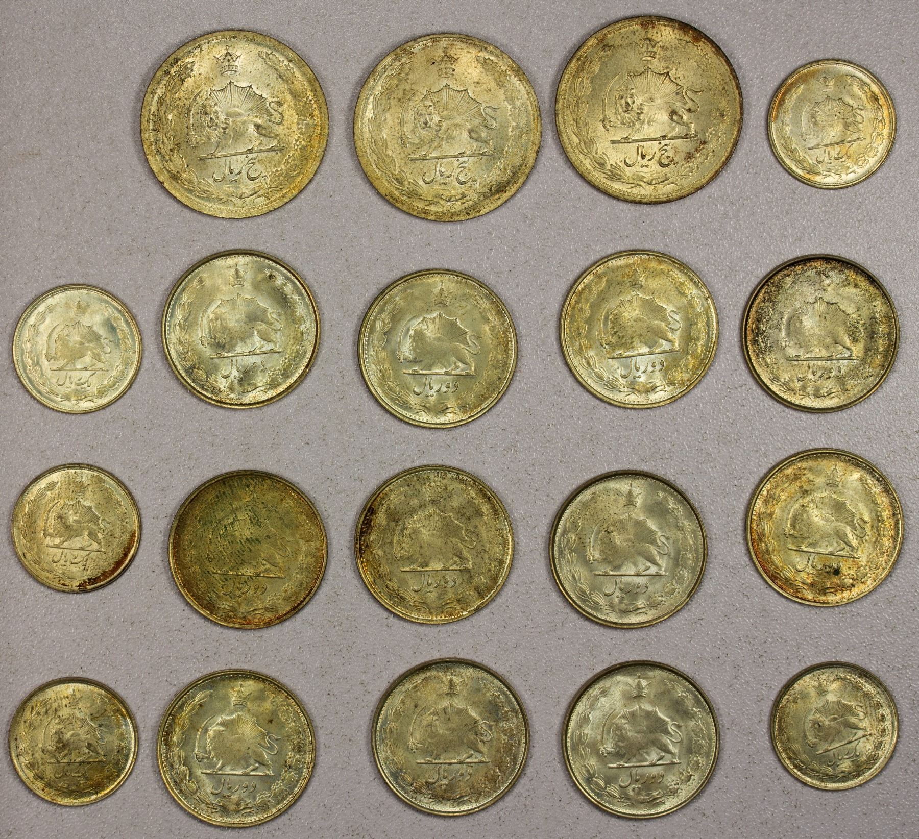 IRAN: LOT of 19 coins, a lovely group of silver WWII coins struck in 1944 including; 5 rials SH1323 (3), 2 rials SH1323 (11), and 1 rial SH1323 (5), all in lustrous mint state UNC quality, retail value $400, lot of 19 coins.