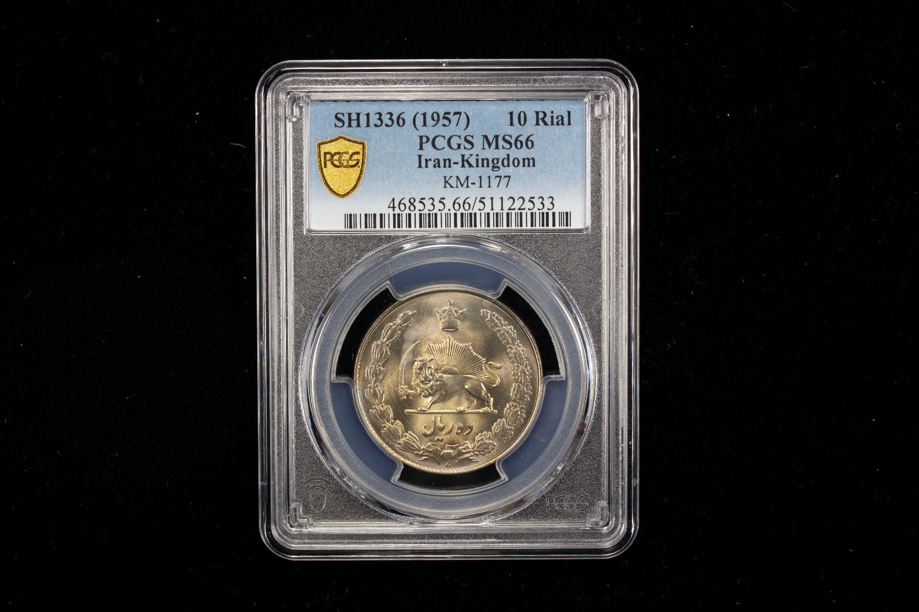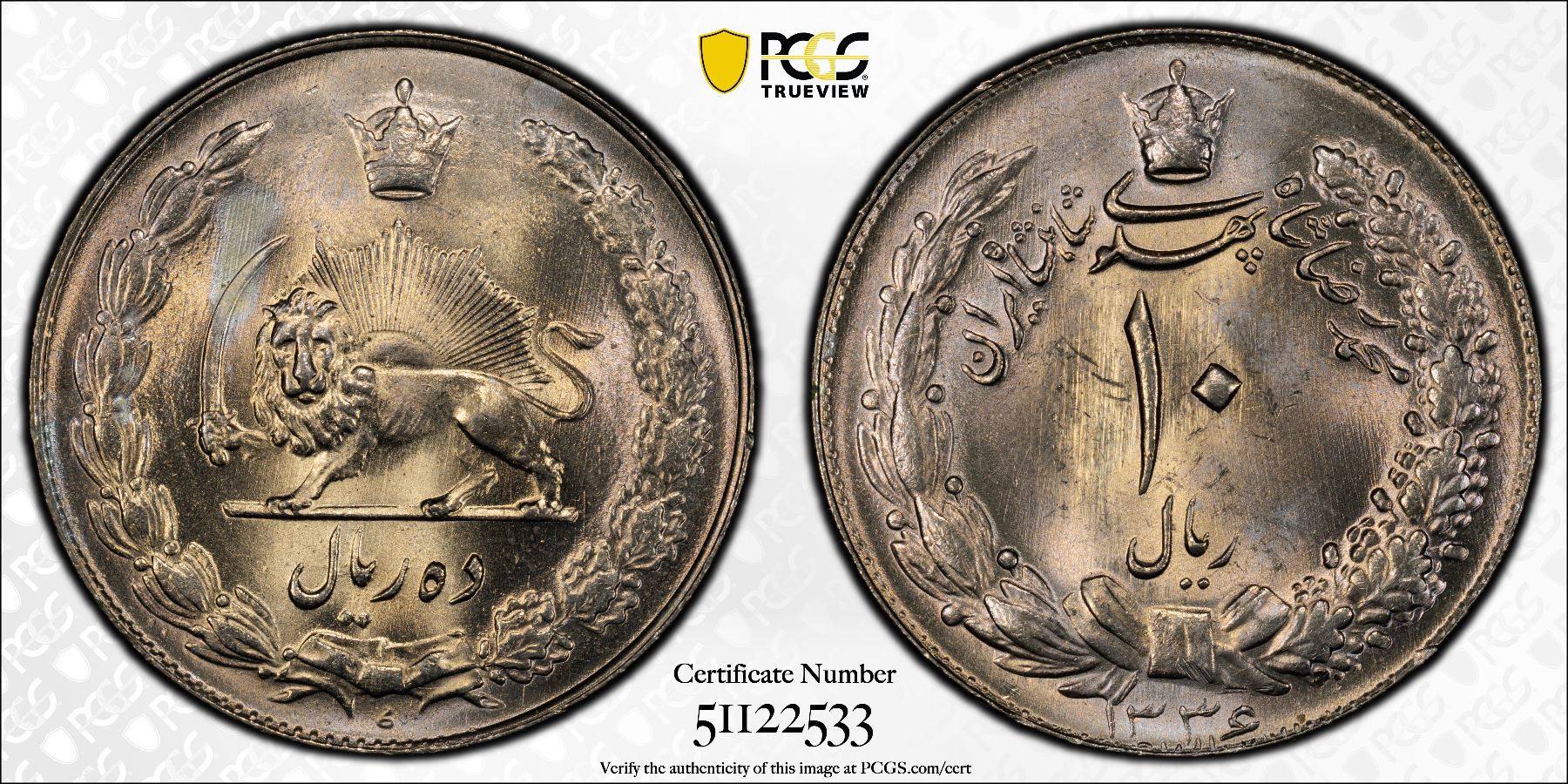 IRAN: Mohammad Reza Shah, 1941-1979, 10 rials, SH1336, PCGS MS66