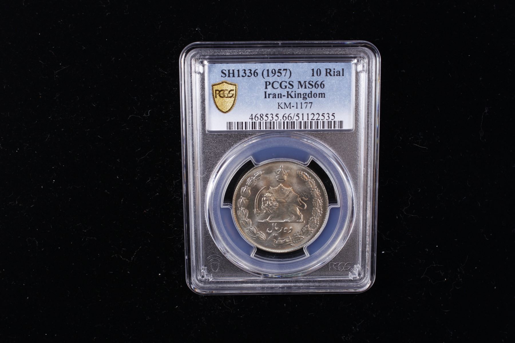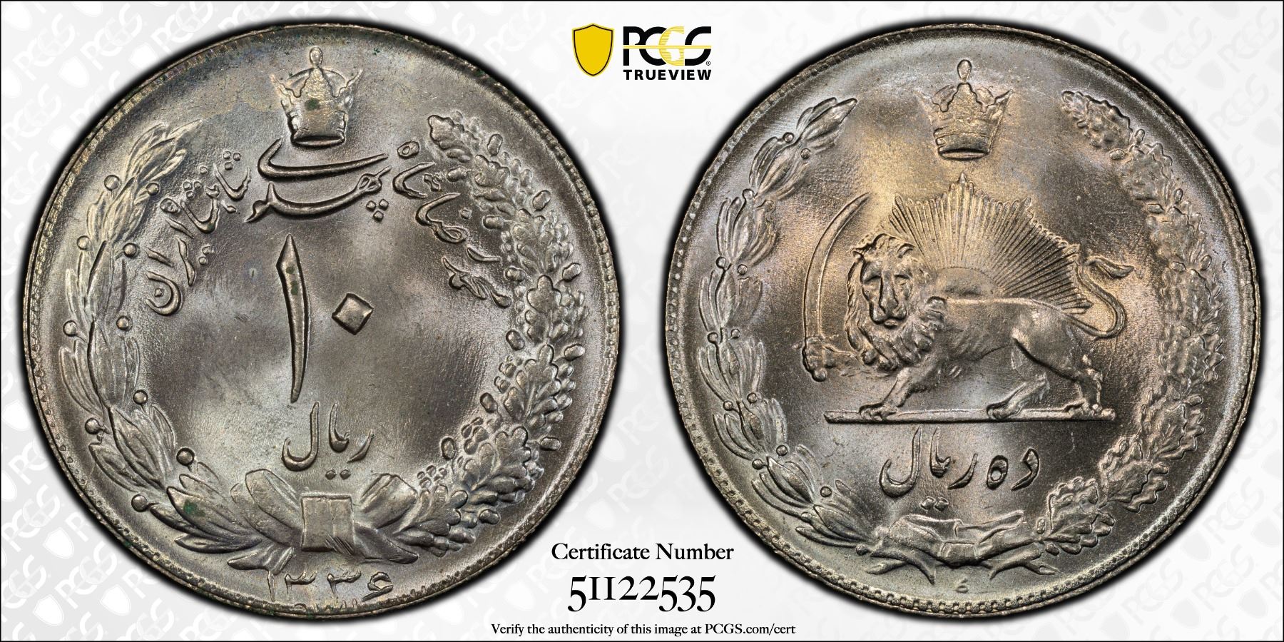 IRAN: Mohammad Reza Shah, 1941-1979, 10 rials, SH1336, KM-1177, a fantastic lustrous example! PCGS graded MS66.