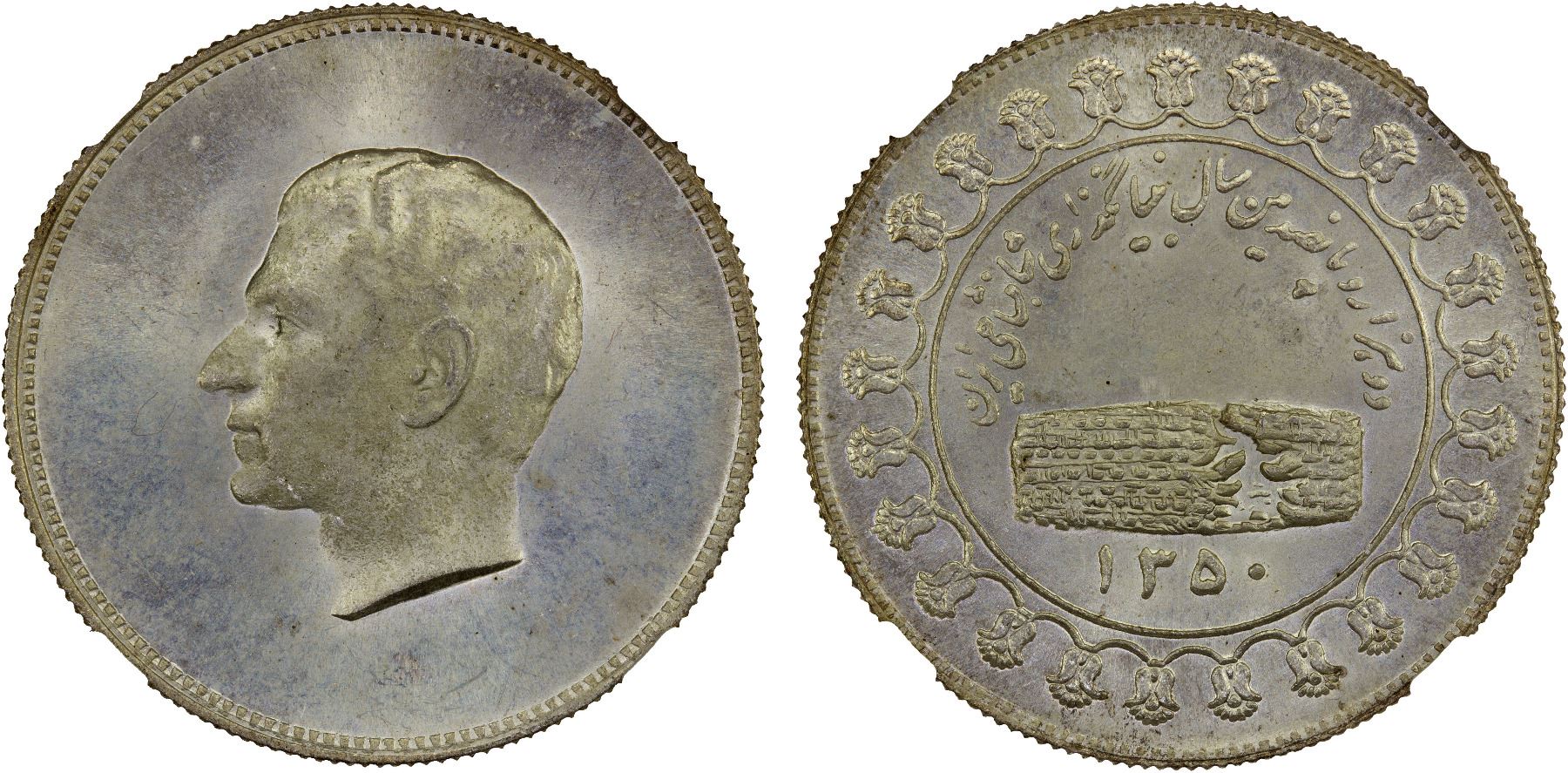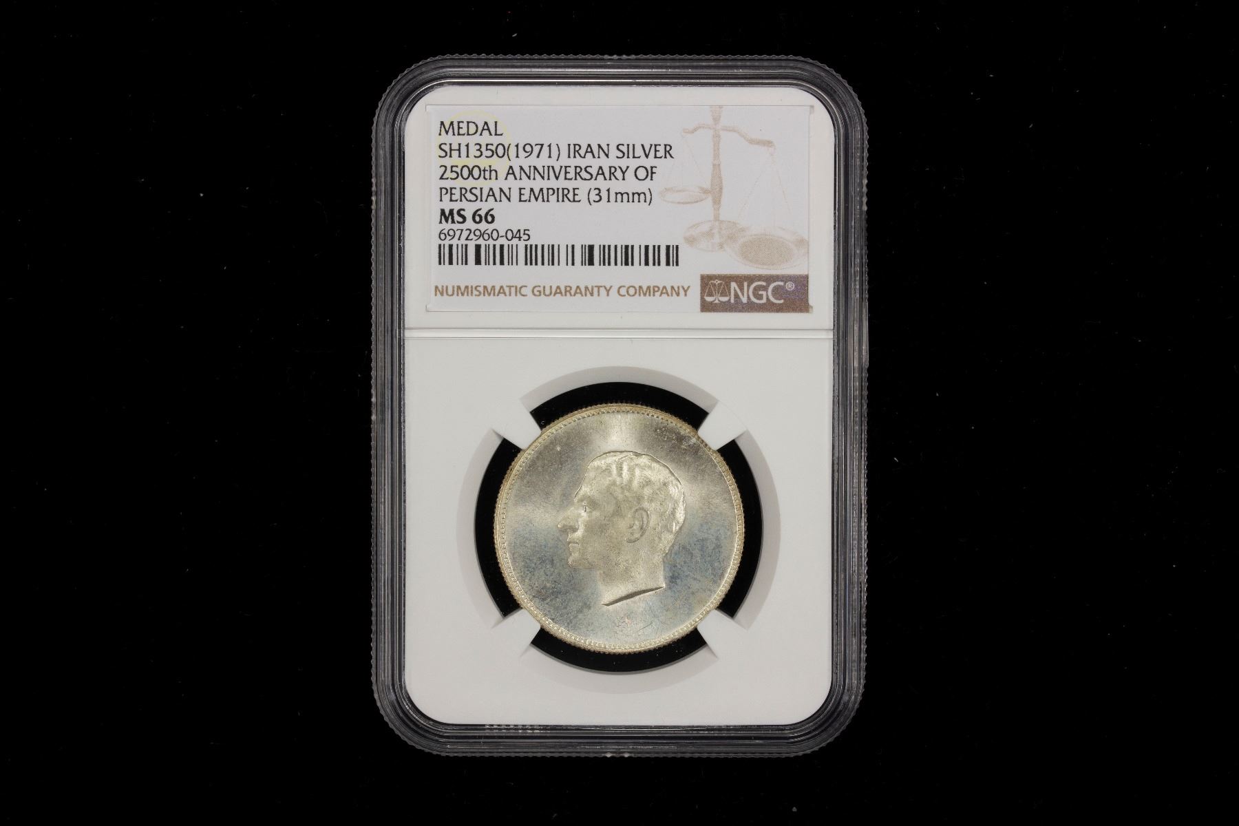 IRAN: Mohammad Reza Shah, 1941-1979, AR medal, SH1350 (1971), 31mm silver medal commemorating the 2500th Anniversary of the Persian Empire, depicts the Cyrus Cylinder, a fantastic lustrous example! NGC graded MS66.