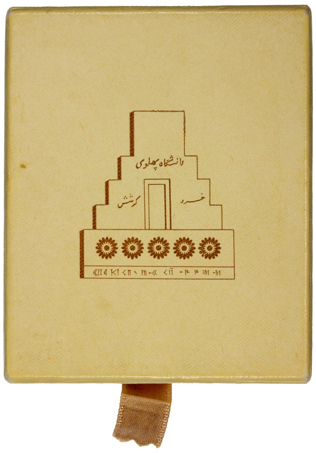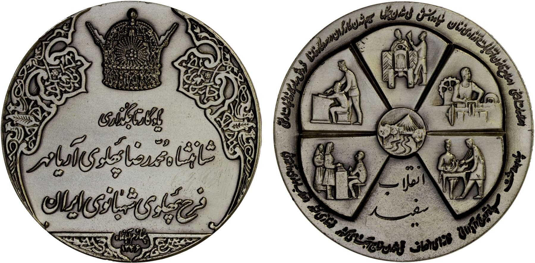IRAN: Muhammad Reza Shah, 1941-1979, AR medal (40.00g), SH1346, 45mm, crown within ornamental field, legend below honoring the Shah and the Queen Farah // five scenes of education and industry within hexafoil, marked STERLING SILVER 925/1000 on the edge; in original box with legend in both Farsi and cuneiform, Choice AU, R.