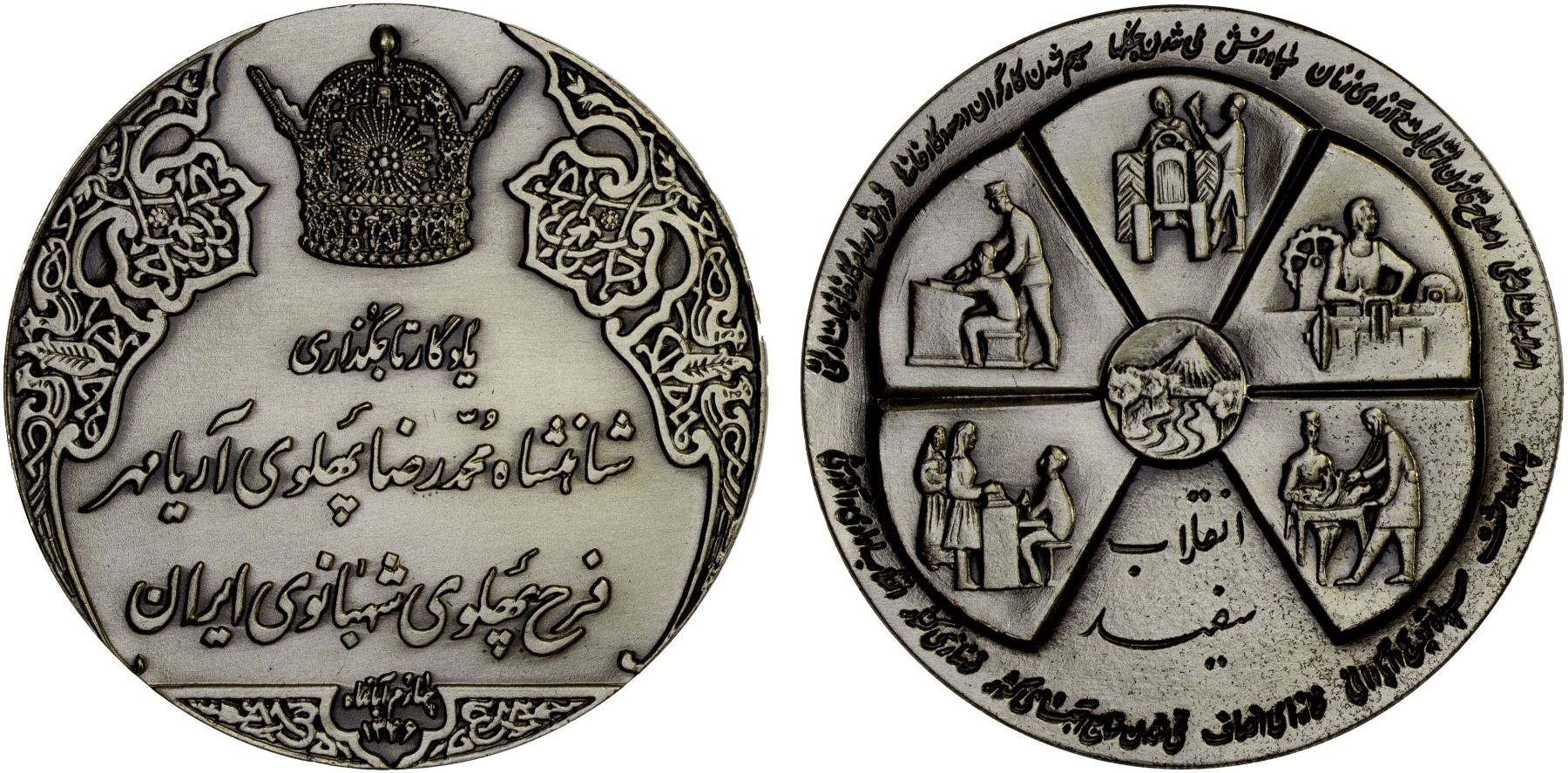 IRAN: Muhammad Reza Shah, 1941-1979, AR medal (40.00g), SH1346, 45mm, crown within ornamental field, legend below honoring the Shah and the Queen Farah // five scenes of education and industry within hexafoil, marked STERLING SILVER 925/1000 on the edge; in original box with legend in both Farsi and cuneiform, Choice AU, R.