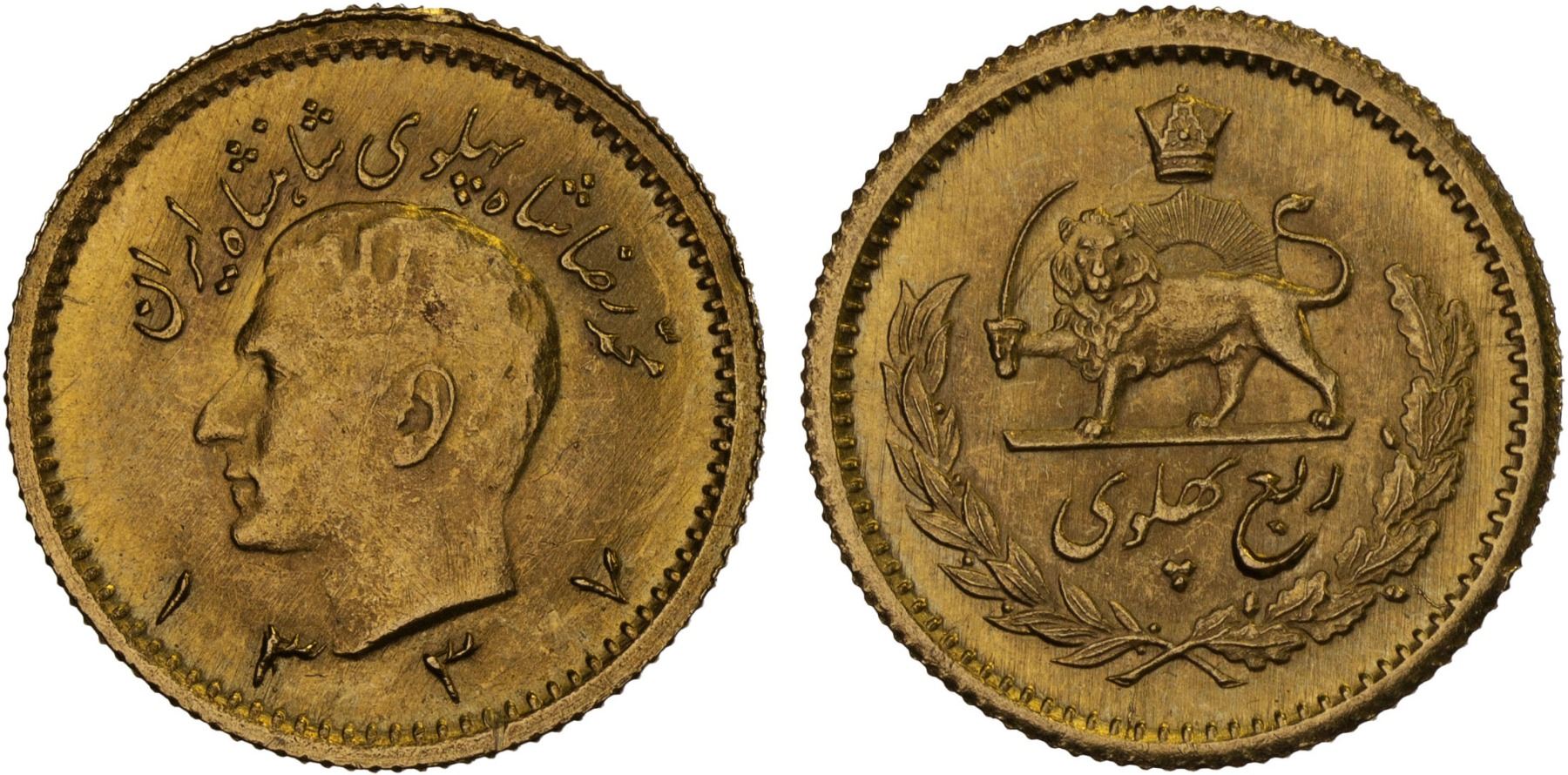 IRAN: Muhammad Reza Shah, 1941-1979, AV 1/4 pahlavi, SH1337, BU