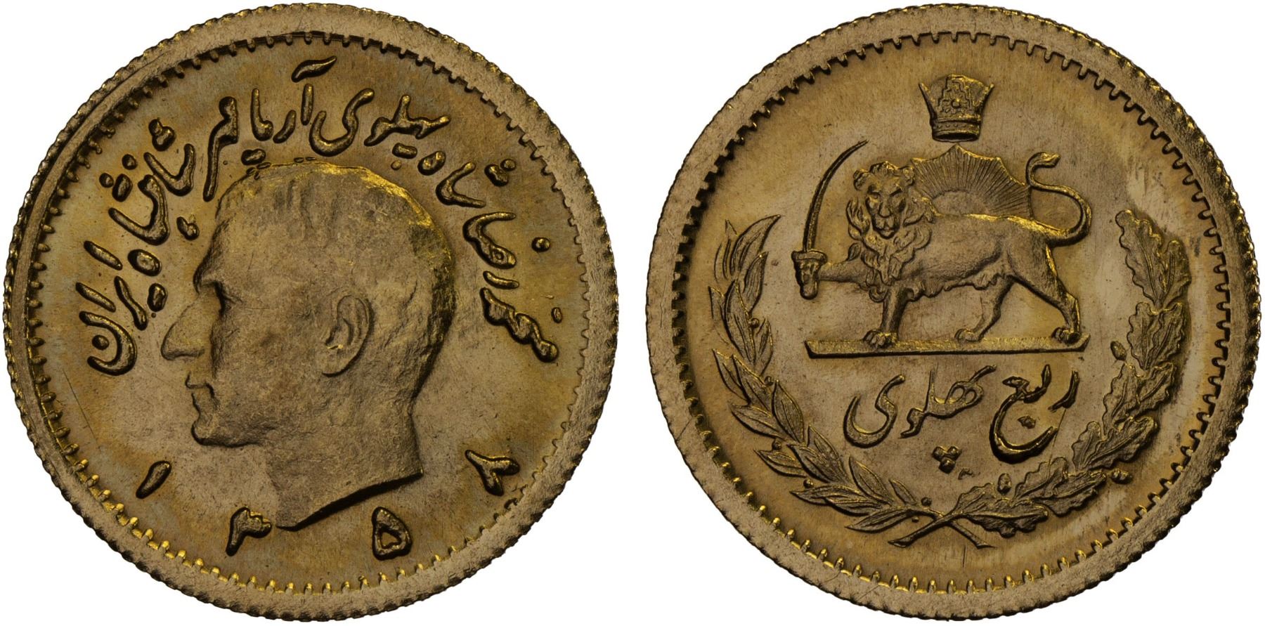 IRAN: Muhammad Reza Shah, 1941-1979, AV 1/4 pahlavi, SH1358, KM-1198, with the additional Shah's title aryamehr, last issue in the name of the shah, actually struck in advance for the New Year's Day, but the revolution was completed a few weeks before the end of SH1357, BU.