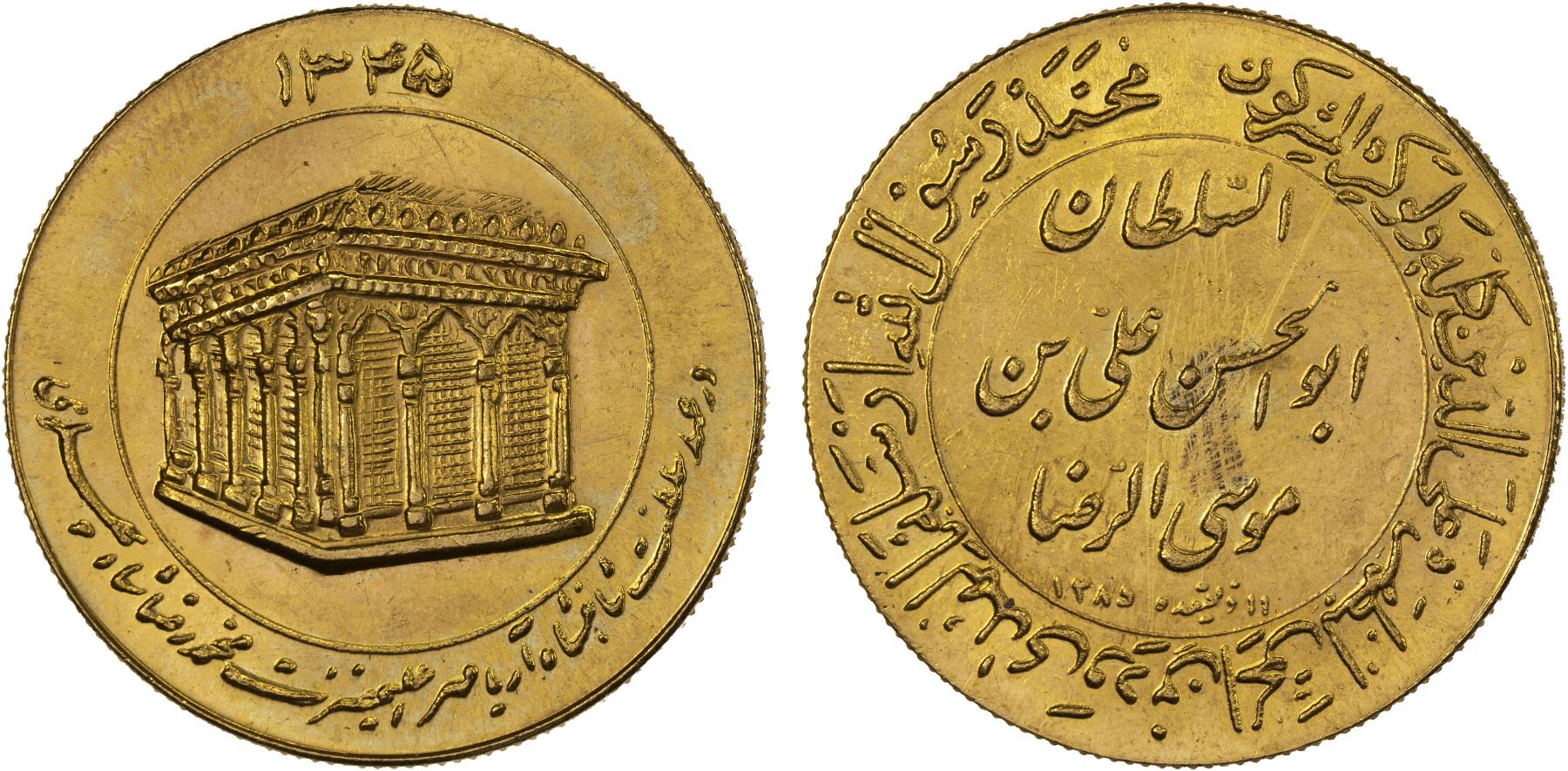 IRAN: Muhammad Reza Shah, 1941-1979, AV medal (20.00g), SH1345 (1966), gold religious medal, interior of the holy shrine of Imam Reza in Mashhad // tthe 8th Shi'ite Imam. Imam Reza, cited by his full name in Arabic: Abu'l-Hasan 'Ali b. Musa al-Ridha, scratches on reverse, Brilliant Unc, RR. Fineness not indicated, but likely 900 fine.