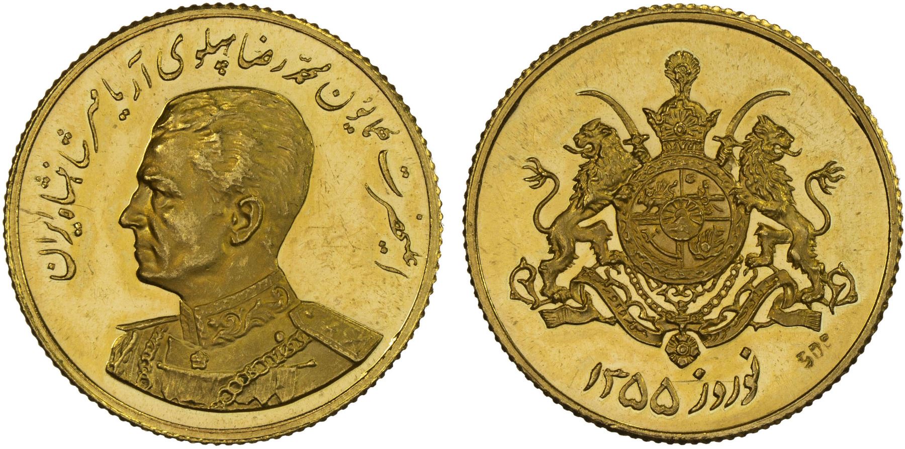 IRAN: Muhammad Reza Shah, 1941-1979, AV medal (3.95g), SH1355, gold new year's medal, portrait of the Shah // coat of arms, stamped 900 (fineness); struck by the Huguenin mint in Lo Locle, Switzerland, Proof, R.