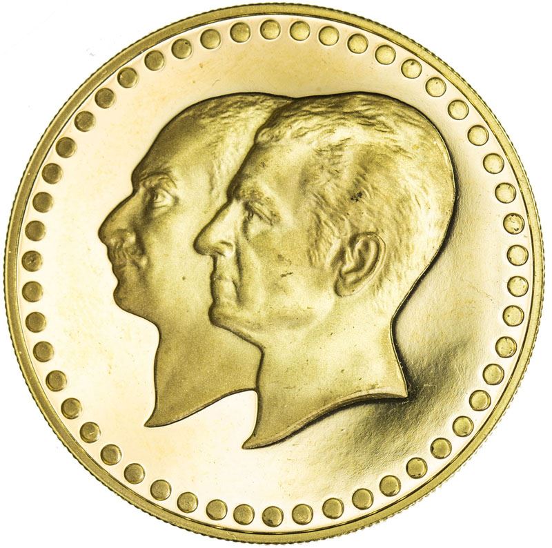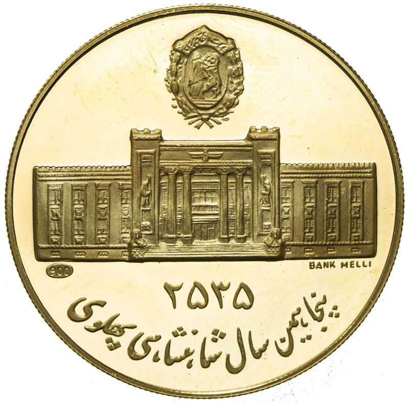 IRAN: Muhammad Reza Shah, 1941-1979, AV medal (9.93g), MS2535, Hosseini, p.301, for the 50th Anniversary of Pahlavi Empire, conjoined busts of Muhammad Reza Shah & his father Reza Shah // Bank Melli building.900 fine, Proof.