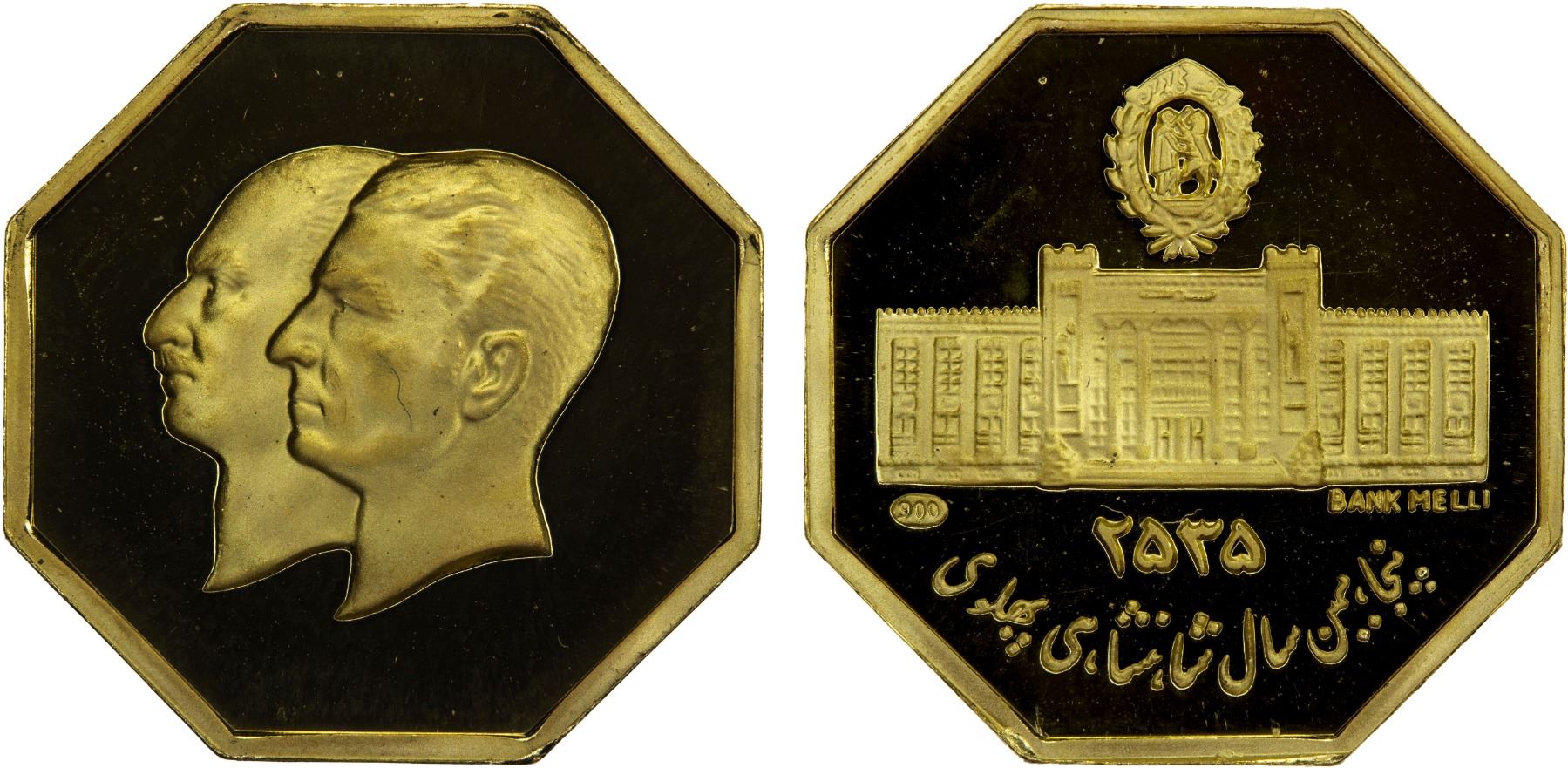 IRAN: Muhammad Reza Shah, 1941-1979, AV octagonal medal (2.50g), MS2535 (1976) (16mm) 50th Anniversary of the Pahlavi Empire: conjoined busts of Muhammad Reza Shah & his father Reza Shah // Bank Melli building, stamped .900 fine, Proof.