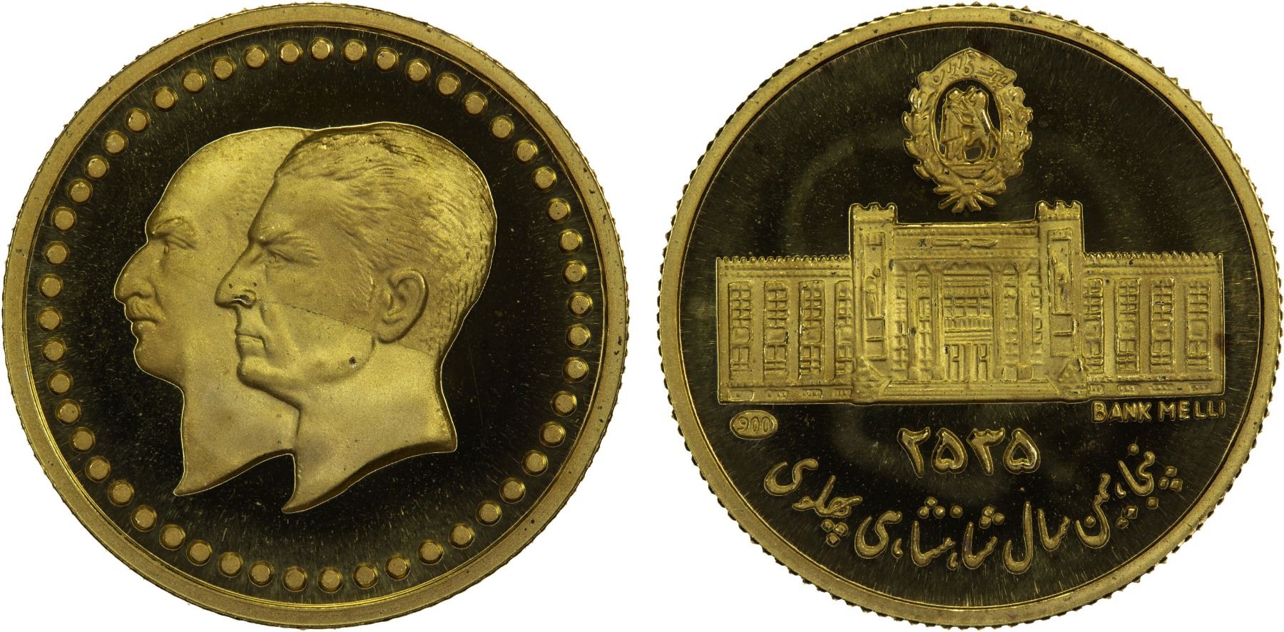 IRAN: Muhammad Reza Shah, 1941-1979, AV round medal (2.50g), MS2535 (1976) (16mm) 50th Anniversary of the Pahlavi Empire: conjoined busts of Muhammad Reza Shah & his father Reza Shah // Bank Melli building, stamped .900 fine, Proof.