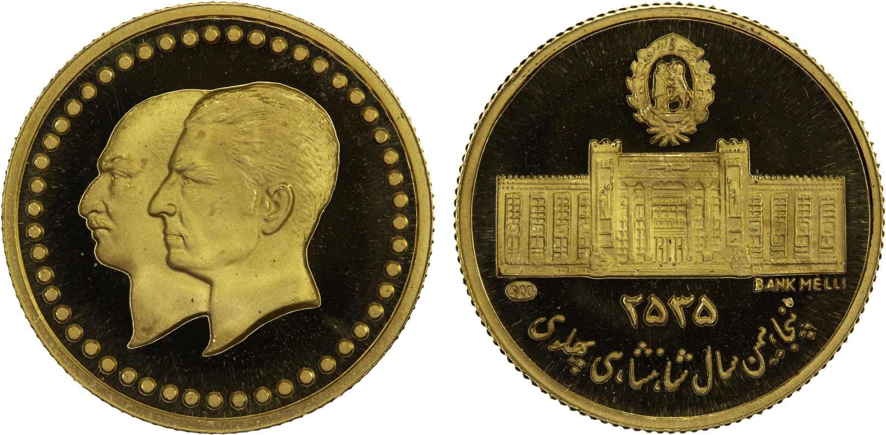 IRAN: Muhammad Reza Shah, 1941-1979, AV round medal (2.50g), MS2535 (1976) (16mm) 50th Anniversary of the Pahlavi Empire: conjoined busts of Muhammad Reza Shah & his father Reza Shah // Bank Melli building, stamped .900 fine, Proof.
