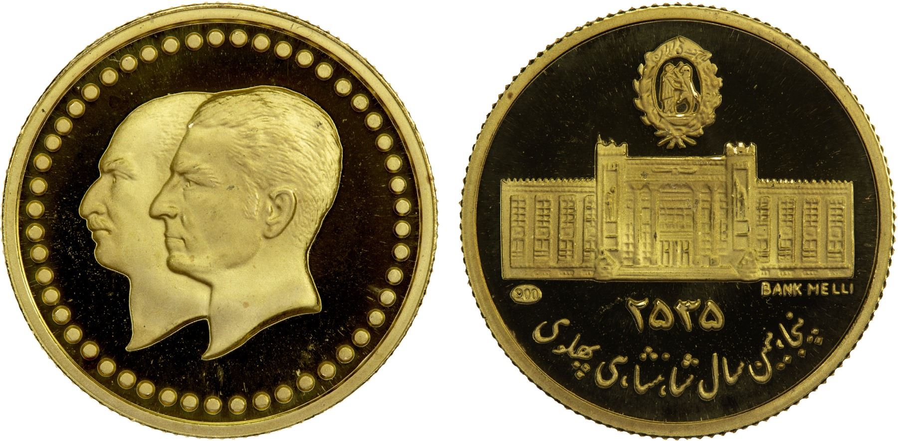 IRAN: Muhammad Reza Shah, 1941-1979, AV round medal (2.50g), MS2535 (1976) (16mm) 50th Anniversary of the Pahlavi Empire: conjoined busts of Muhammad Reza Shah & his father Reza Shah // Bank Melli building, stamped .900 fine, Proof.