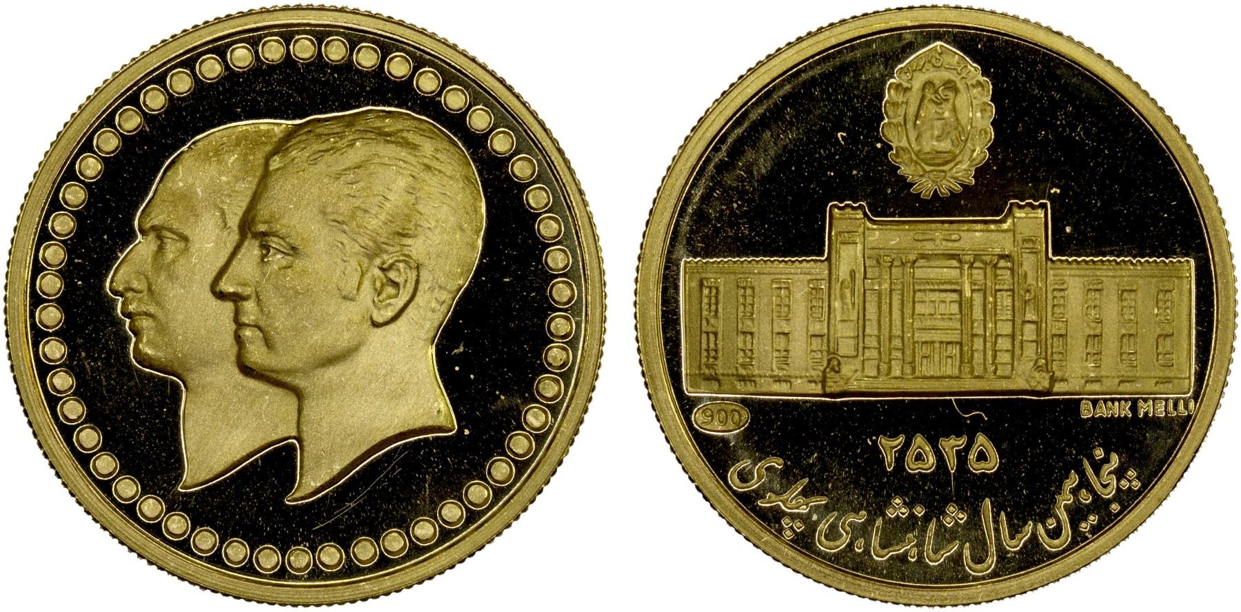 IRAN: Muhammad Reza Shah, 1941-1979, AV round medal (5.01g), MS2535 (1976) (21mm) 50th Anniversary of the Pahlavi Empire: conjoined busts of Muhammad Reza Shah & his father Reza Shah // Bank Melli building, stamped .900 fine, Proof.