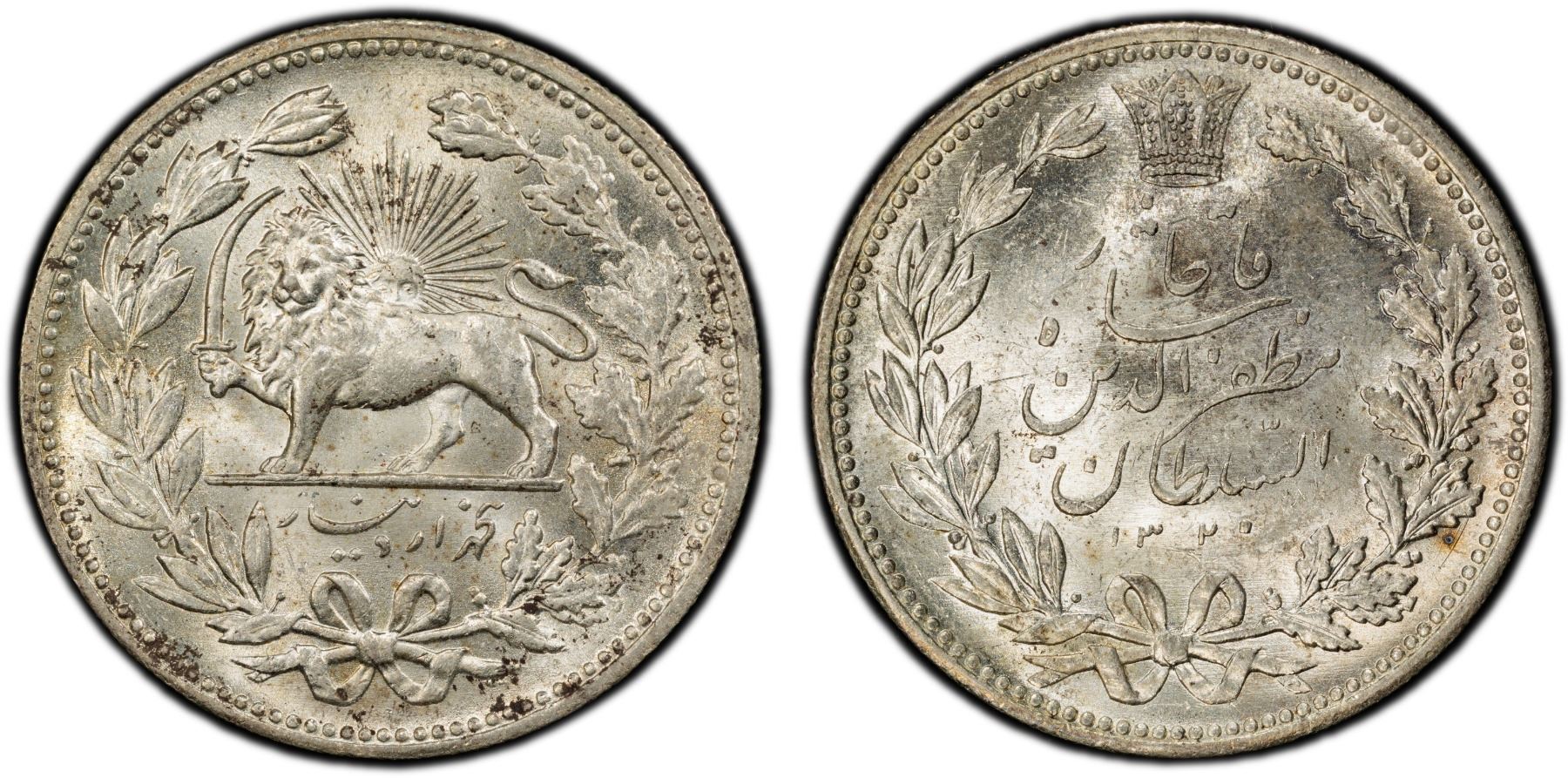 IRAN: Muzaffar al-Din Shah, 1896-1907, AR 5000 dinars, AH1320, KM-976, a lovely mint state example! PCGS graded MS63. Struck at the St. Petersburg Mint in Russia, with initials AA and G in Cyrillic of the engraver A. A. Grilikhes at the bottom of the reverse ribbons.