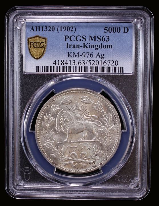 IRAN: Muzaffar al-Din Shah, 1896-1907, AR 5000 dinars, AH1320, PCGS MS63