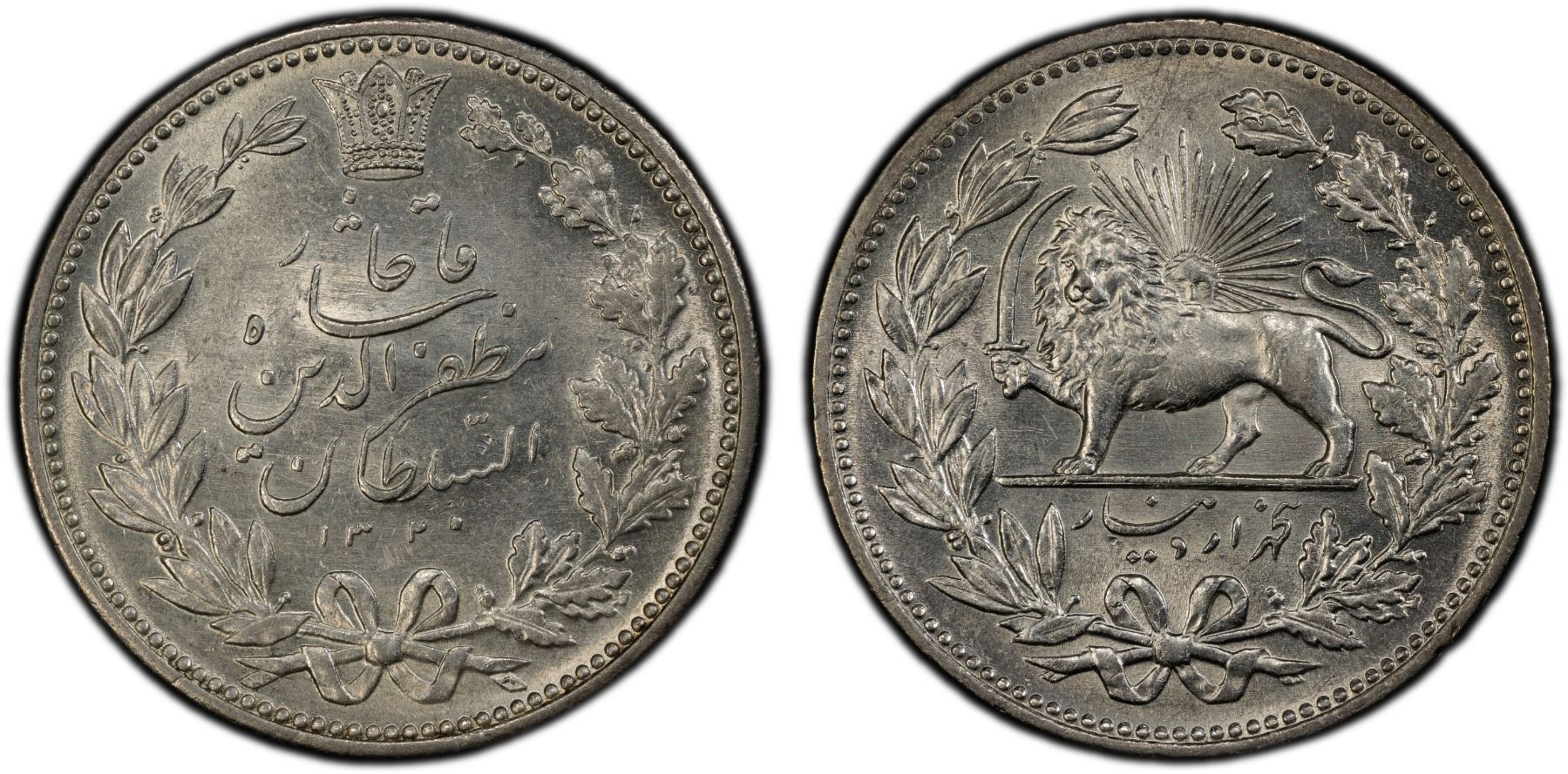 IRAN: Muzaffar al-Din Shah, 1896-1907, AR 5000 dinars, AH1320, PCGS MS63