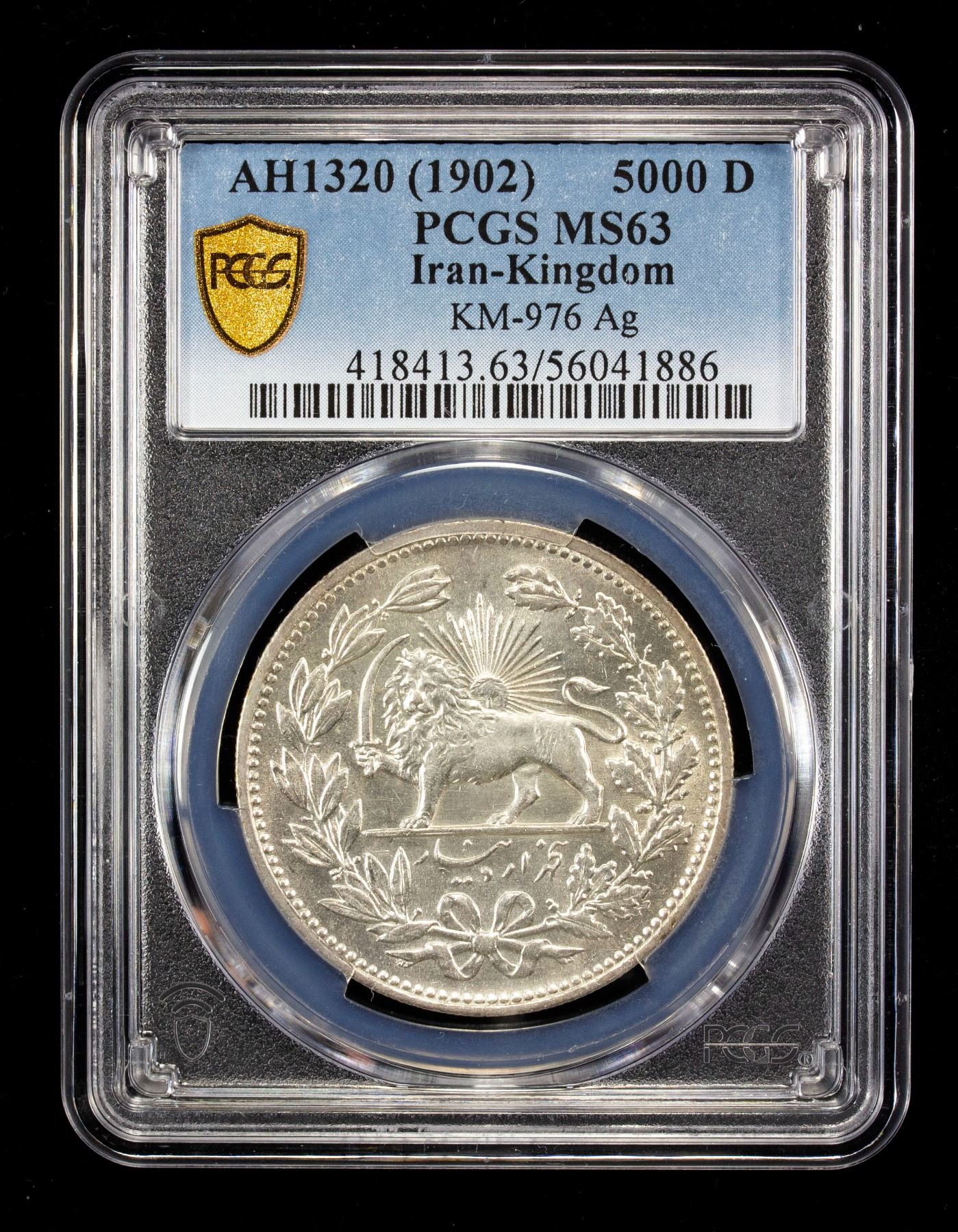 IRAN: Muzaffar al-Din Shah, 1896-1907, AR 5000 dinars, AH1320, KM-976, a lovely lustrous mint state example! PCGS graded MS63, ex Bowers & Ruddy Auctions, "The Austin Collection", May-June 1974, Lot 01646, with original auction ticket. Struck at the St. Petersburg Mint in Russia, with initials AA and G in Cyrillic of the engraver A. A. Grilikhes at the bottom of the reverse ribbons.