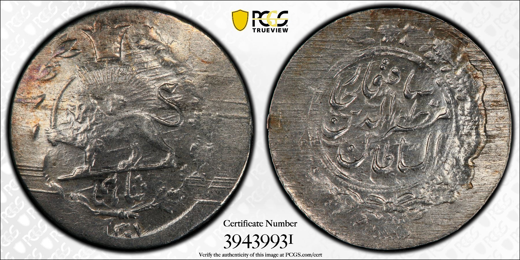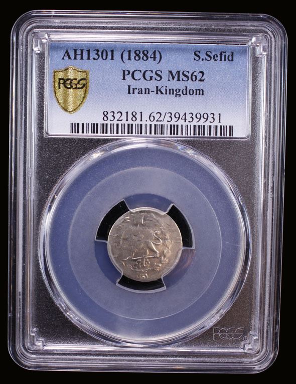 IRAN: Muzaffar al-Din Shah, 1896-1907, AR shahi sefid, Tehran, AH1301, KM-965, muled with KM-889 reverse die of Nasir al-Din Shah, PCGS graded MS62. The 'shahi sefid' (white shahi) were intended mainly as 'nowruz' (new year) gifts and were valued at 150 dinars. They were struck on broader and thinner planchets than the smallest other silver denomination, the quarter kran or 'robi' (250 dinars). This made for a slightly more impressive present at a lower production cost for the mint.