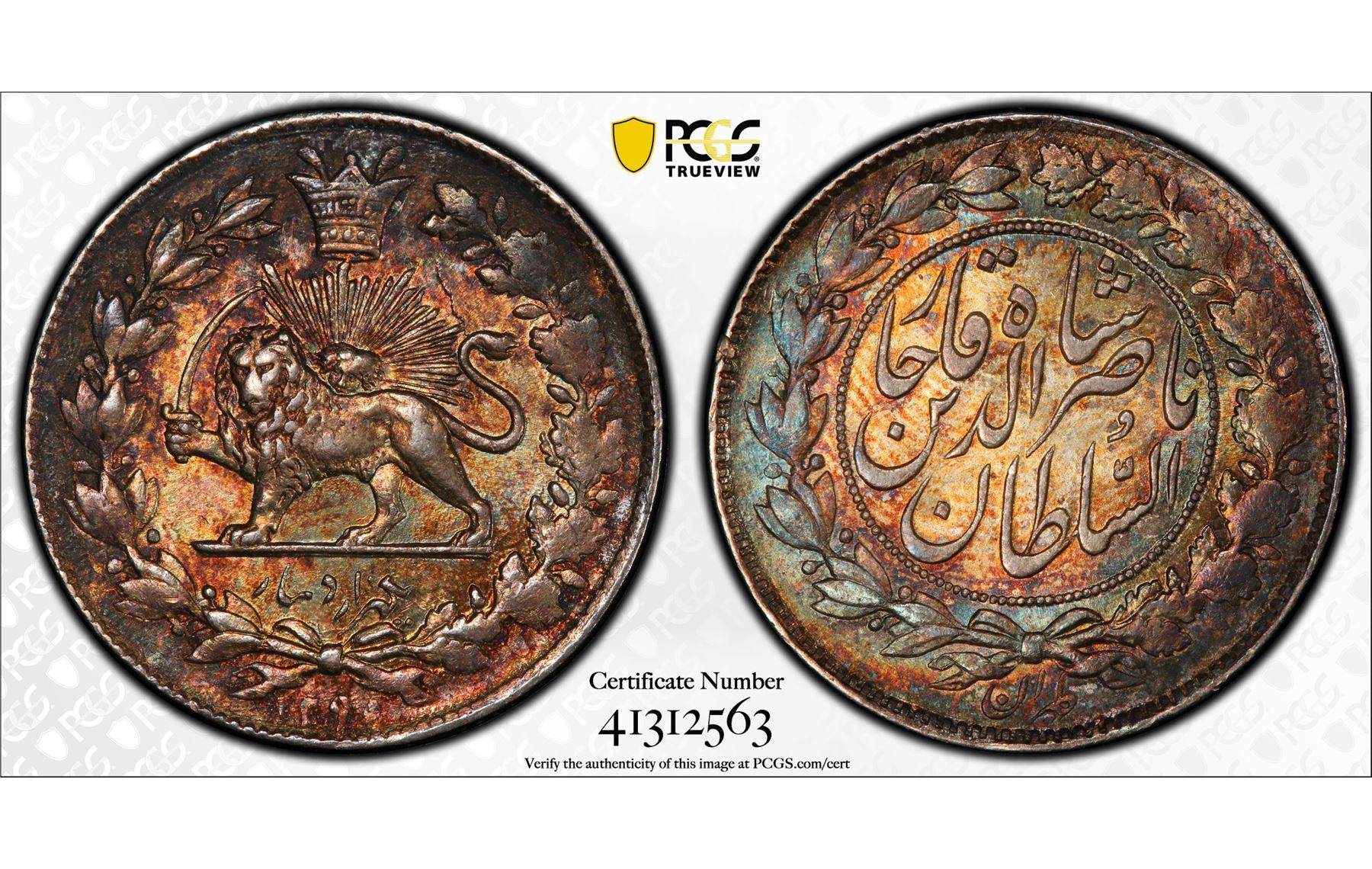 IRAN: Nasir al-Din Shah, 1848-1896, AR 1000 dinars, Tehran, AH1296, KM-899, gorgeous toning, a superb example! PCGS graded MS64.