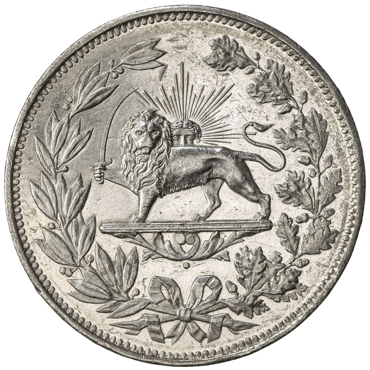 IRAN: Nasir al-Din Shah, 1848-1896, AR 5000 dinars, Tehran, AH1297, KM-914, plain edge, blazing prooflike surfaces, clearly the issue of the Tehran mint, with the rays not extending to the left of the lion's head, two very minor dings at the edge, but all-in-all a spectacular example, or the highest quality for this type, presumably a very early strike from the new dies, possibly even a specimen strike, traces of very light surface hairlines, choice AU, RR.