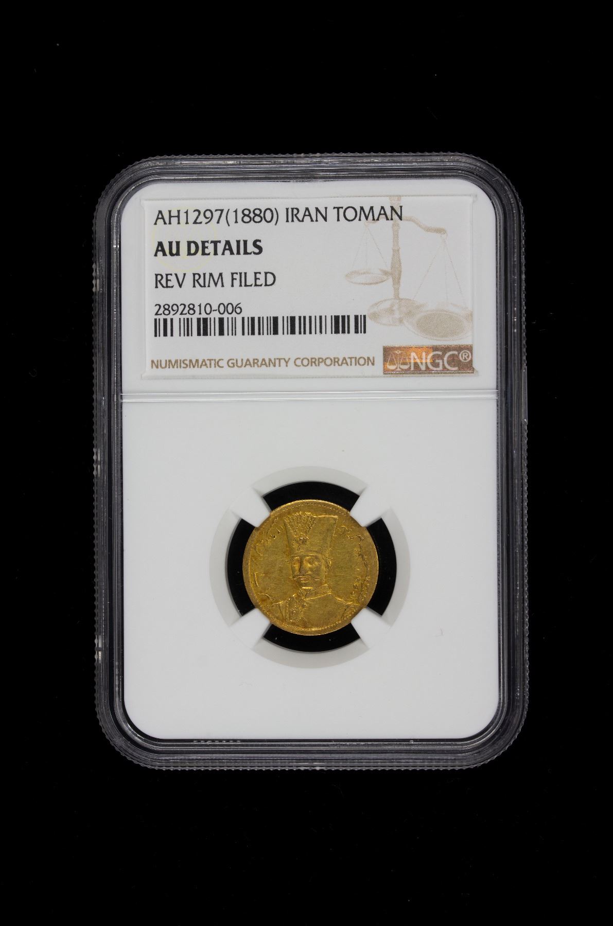 IRAN: Nasir al-Din Shah, 1848-1896, AV toman, Tehran, AH1297, KM-933, reverse rim filed (very minor); first year of issue, NGC graded AU details.