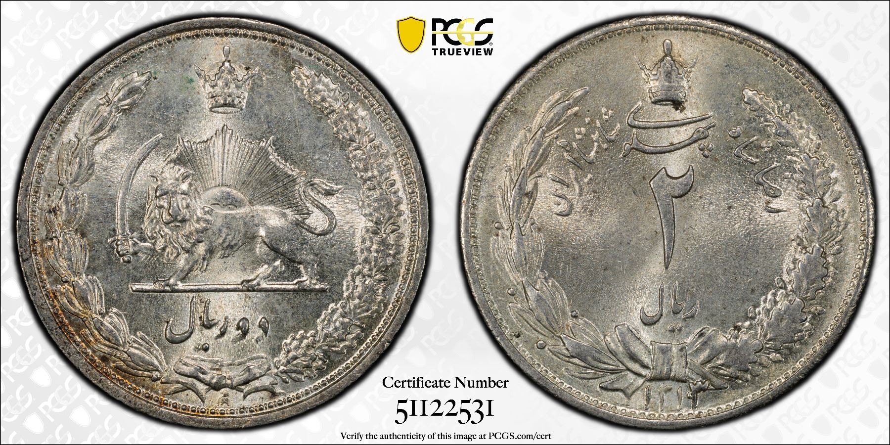 IRAN: Reza Shah, 1925-1941, AR 2 rials, SH1313/0, PCGS MS64