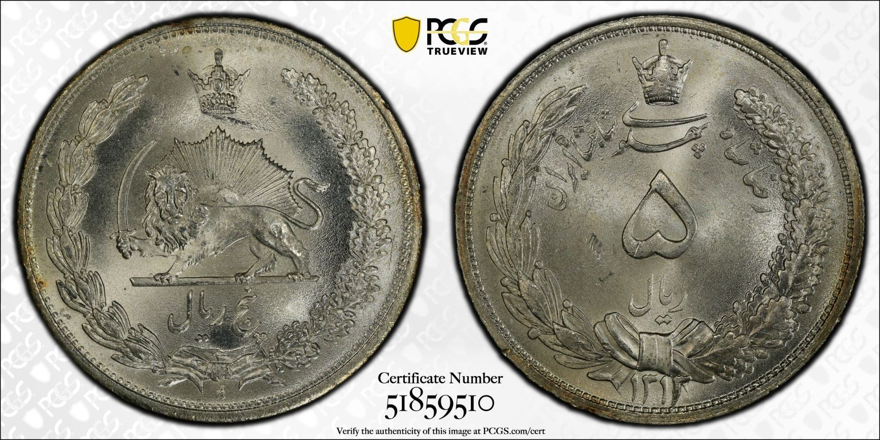 IRAN: Reza Shah, 1925-1941, AR 5 rials, SH1313 (1934), PCGS MS65