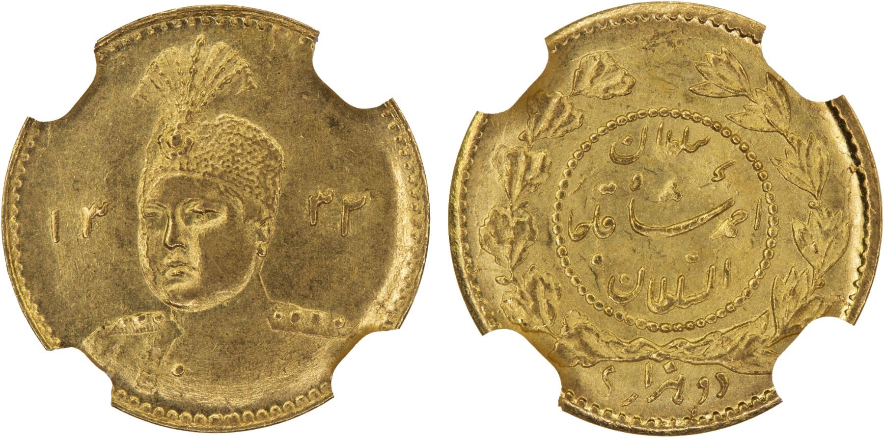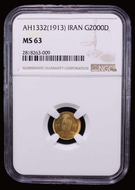 IRAN: Sultan Ahmad Shah, 1909-1925, AV 2000 dinars (1/5 toman), AH1332, KM-1070, Fr-83, nice luster, key date, NGC graded MS63, ex SARC Auction 44 Lot 2419, ex The 1914 Collection. Tied for finest graded at both NGC and PCGS.
