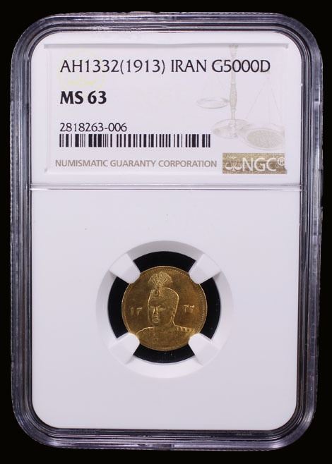 IRAN: Sultan Ahmad Shah, 1909-1925, AV 5000 dinars (1/2 toman), AH1332, KM-1071, lustrous, NGC graded MS63, ex SARC Auction 44 Lot 1093, ex The 1914 Collection. Tied for finest graded at both NGC and PCGS.