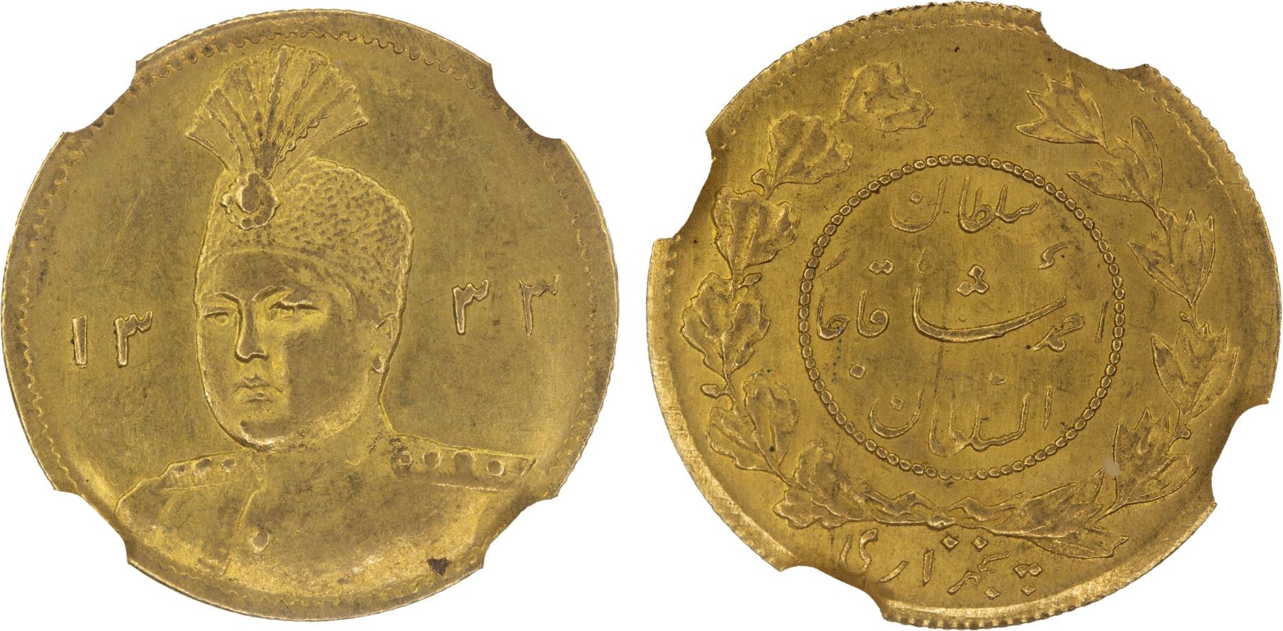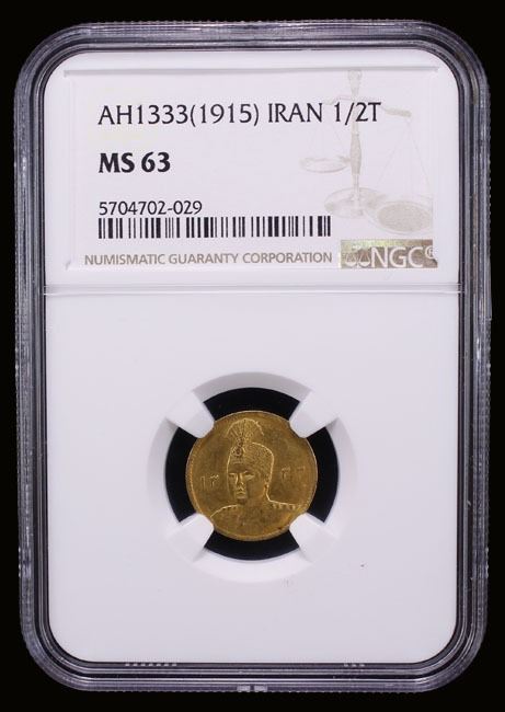 IRAN: Sultan Ahmad Shah, 1909-1925, AV 5000 dinars (1/2 toman), AH1333, KM-1071, Fr-85, lustrous, NGC graded MS63, ex Goldberg Auction 122 Lot 1861, ex The 1914 Collection. Tied for second finest graded at NGC.