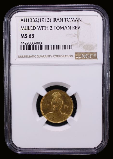 IRAN: Sultan Ahmad Shah, 1909-1925, AV toman, AH1332, KM-1073, Fr-84var, lustrous, mule with unadopted pattern reverse die, NGC graded MS63, ex The 1914 Collection.