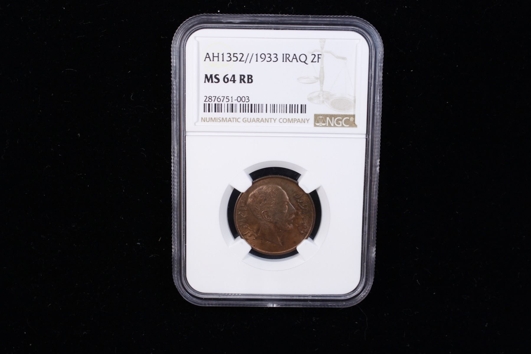 IRAQ: Faisal I, 1921-1933, AE 2 fils, 1933/AH1352, KM-96, satiny luster, lovely orange patina with notes of red and purple, NGC graded MS64 RB.