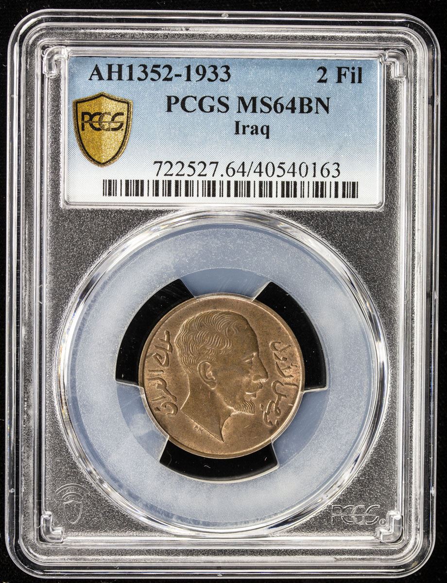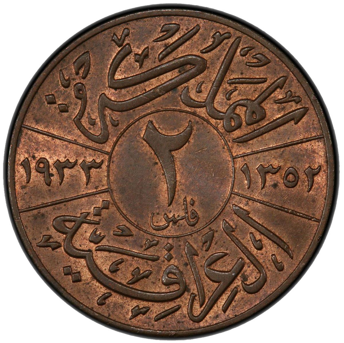 IRAQ: Faisal I, 1921-1933, AE 2 fils, 1933/AH1352, KM-96, a lovely example! PCGS graded MS64 BN.