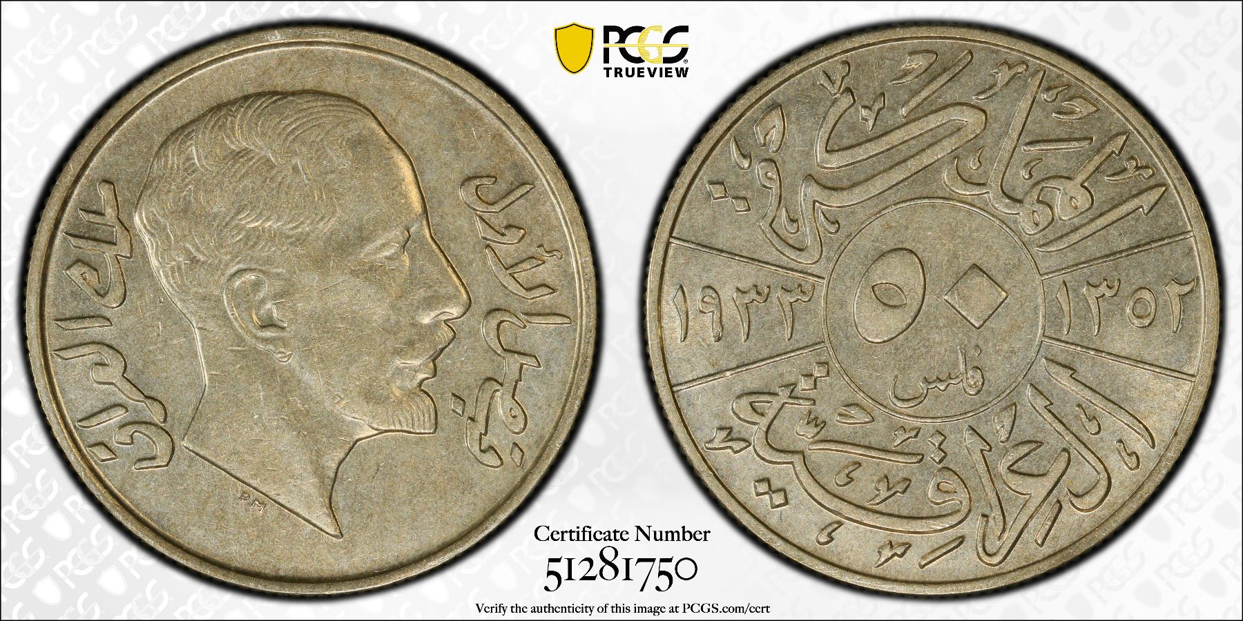 IRAQ: Faisal I, 1921-1933, AR 50 fils, 1933/AH1352, PCGS AU58